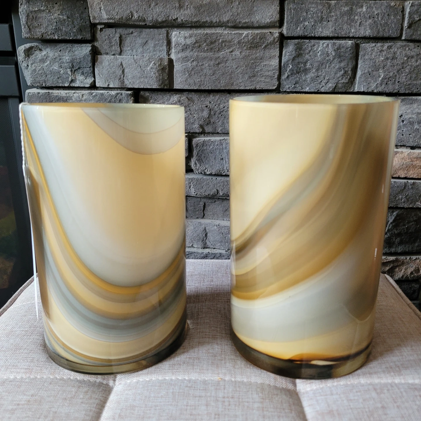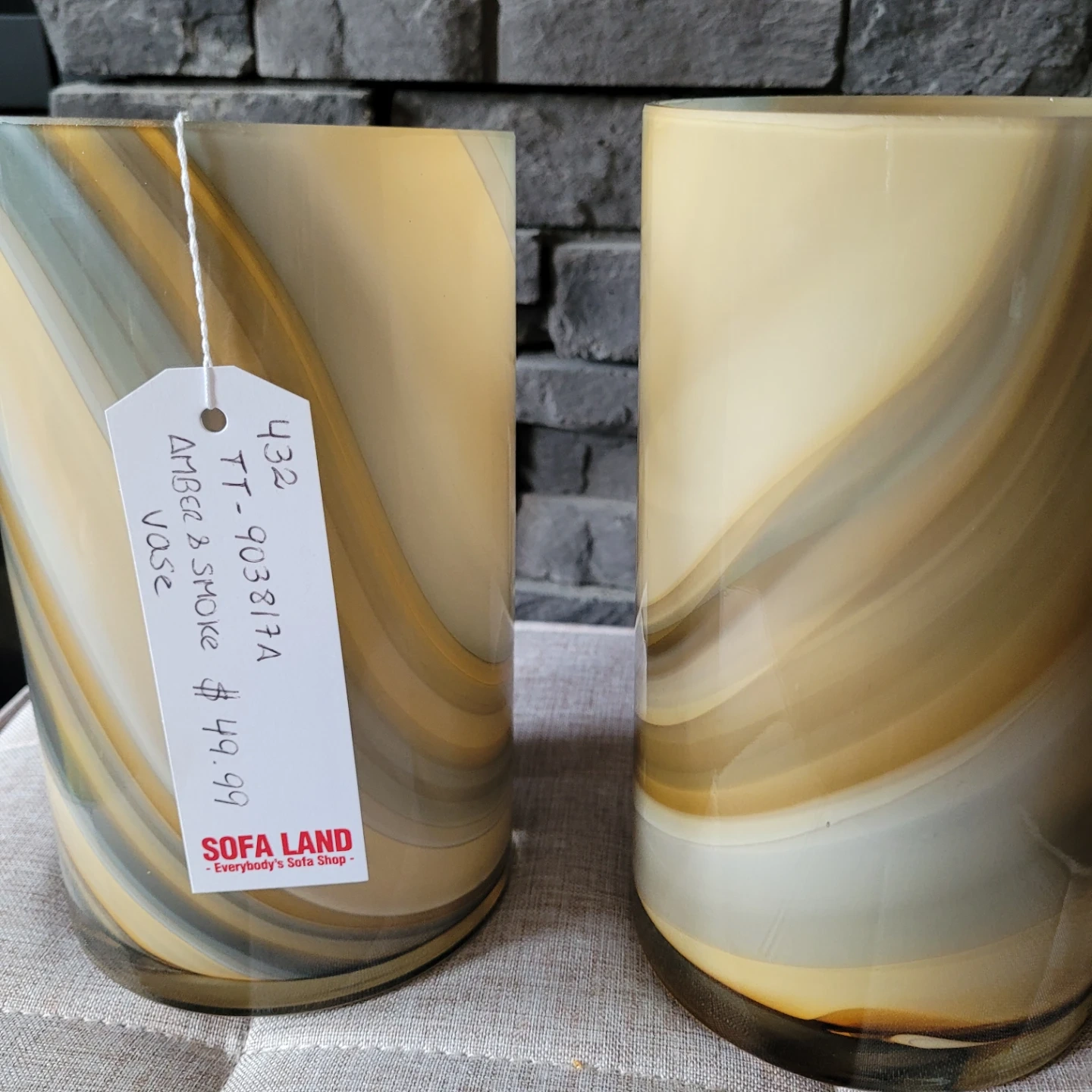 Here's a beautiful set of two Sofa Land vases in an amber and smoke colour palette. They stand just over 8 inches tall and have a diameter of about 5 inches wide.