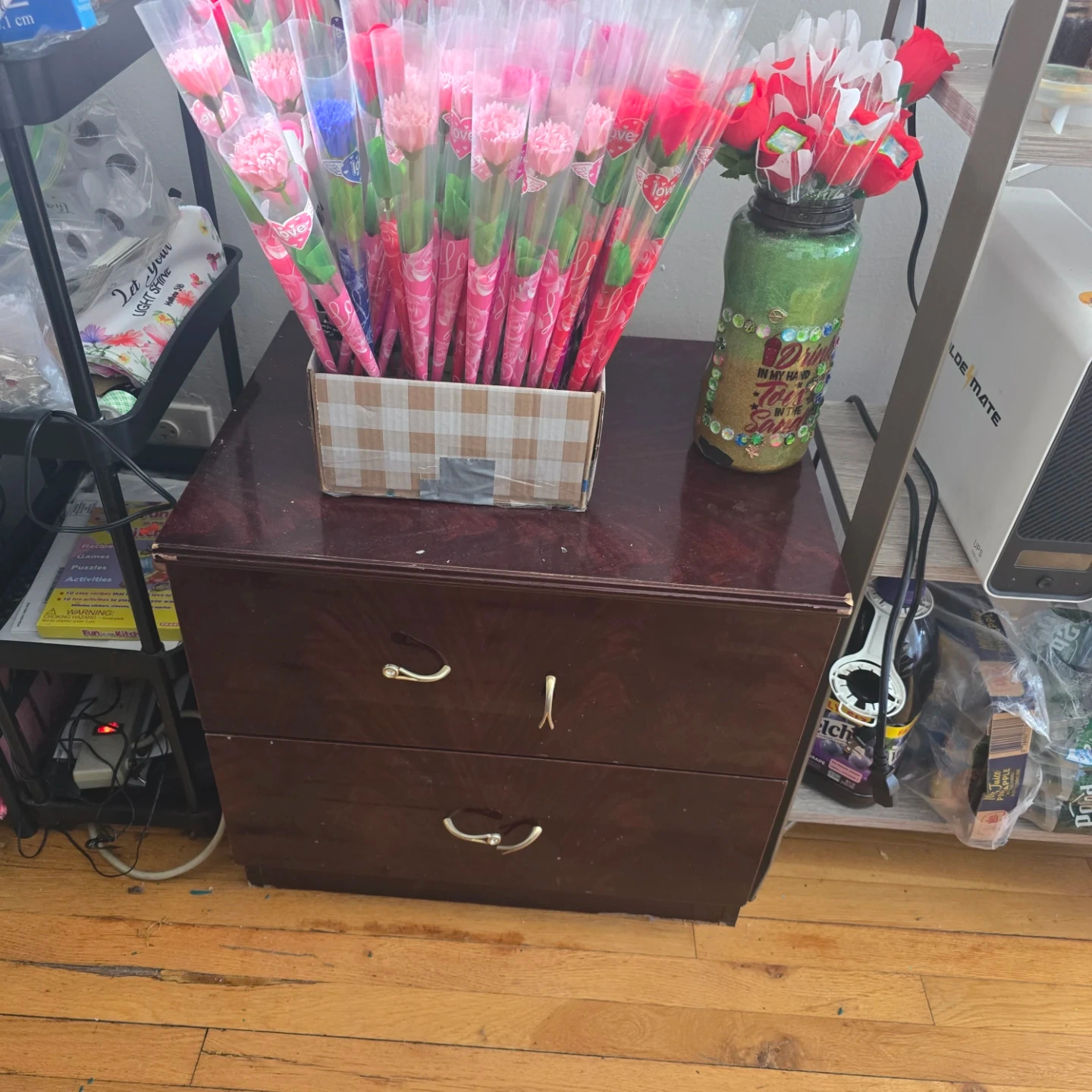 Donating a solid wood dresser with a rich vintage finish — perfect for anyone who appreciates classic, artistic furniture with character.