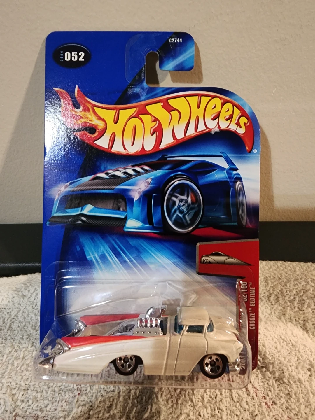 This is a Hot Wheels 052 100 "Grooze "Bedtime" die-cast car from 2007. The car is white with red accents and chrome detailing. It's still in its original packaging.