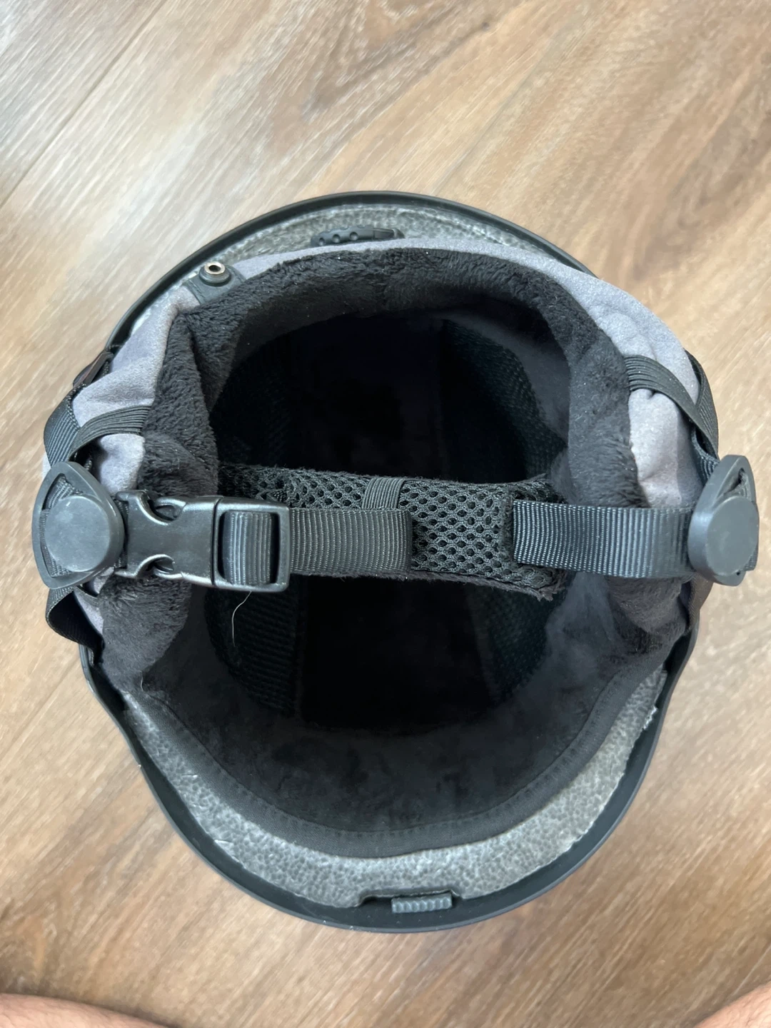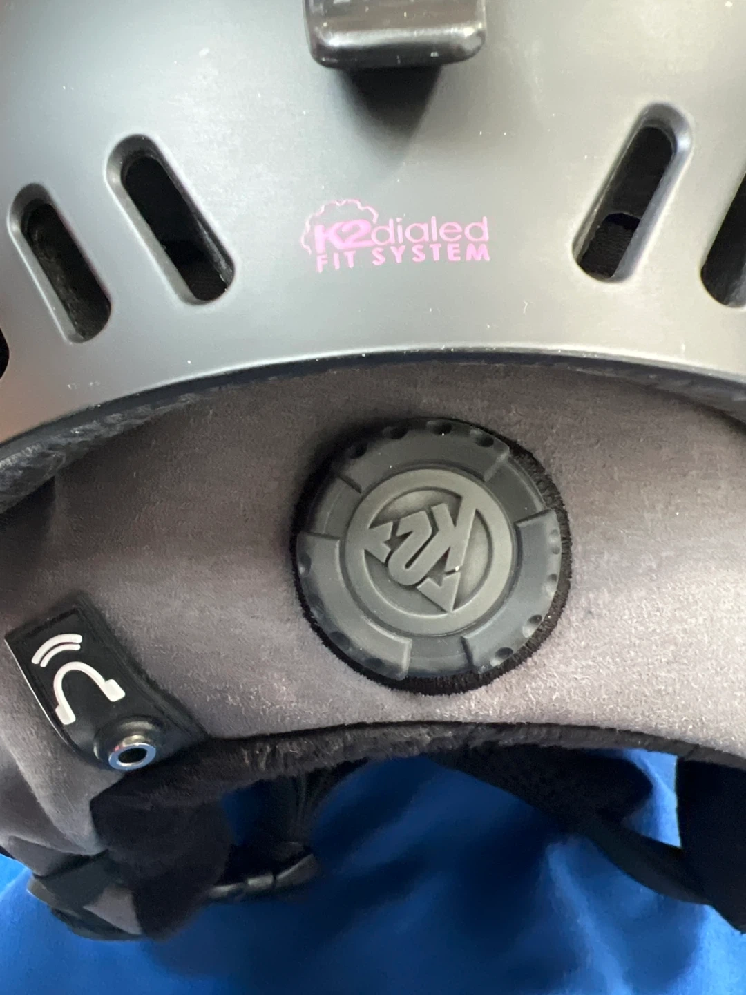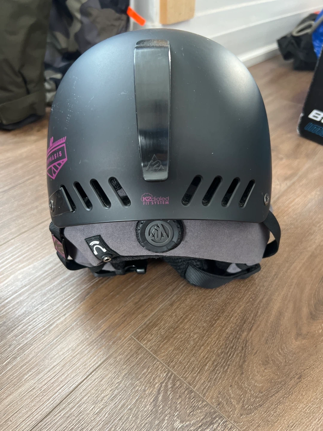 This is a K2 Emphasis ski helmet with a dialed fit system. It's a size small, measuring 51-55cm. The helmet has a black exterior with grey and black interior padding. Multiple scratches visible.