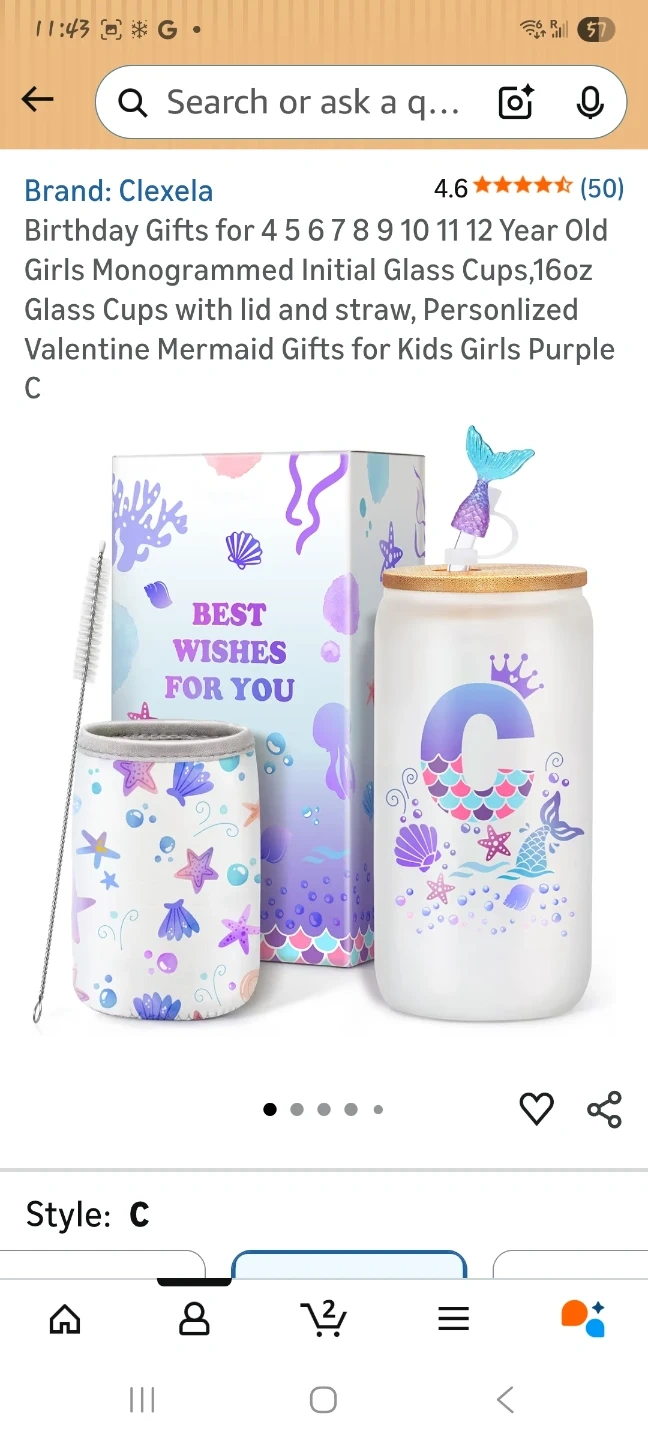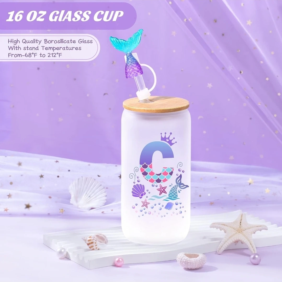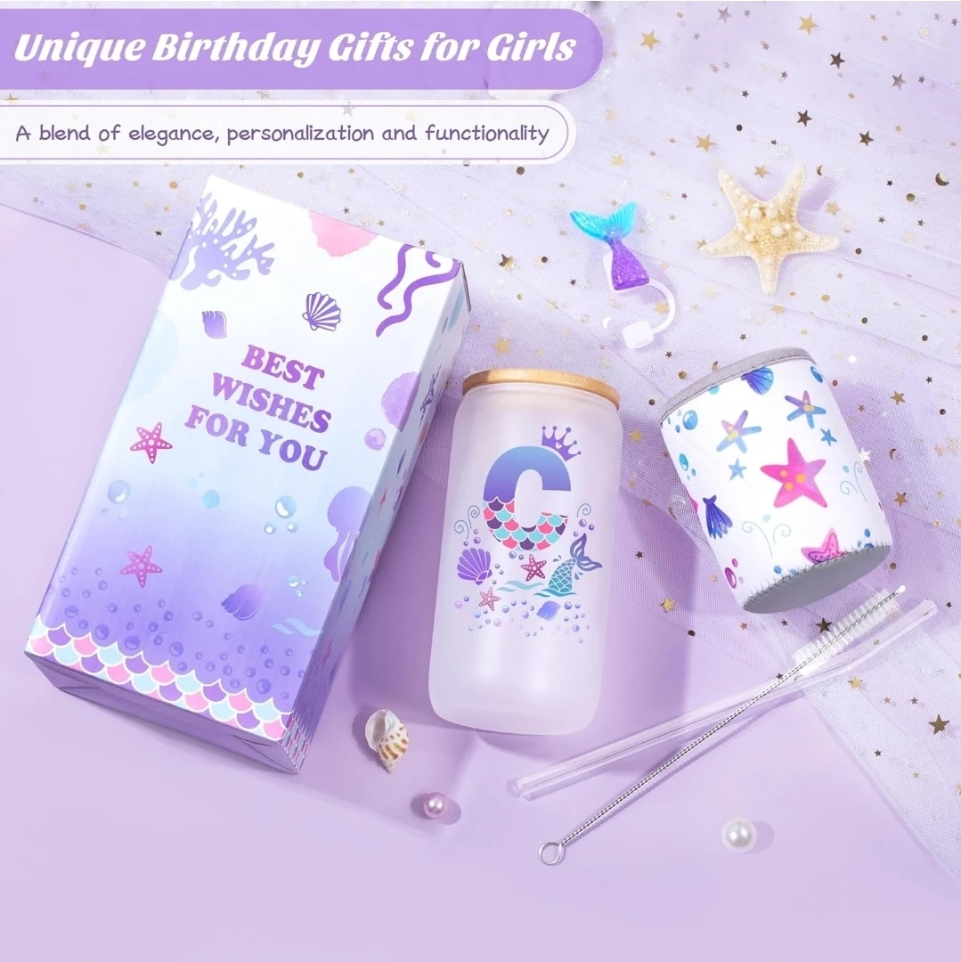 This 16oz glass cup set comes with a bamboo lid, glass straw, straw cleaner, cup sleeve, and a mermaid tail straw cover. It's made from high-quality borosilicate glass and features a fun mermaid design. The set includes a gift box with 'Best Wishes for You' printed on it.