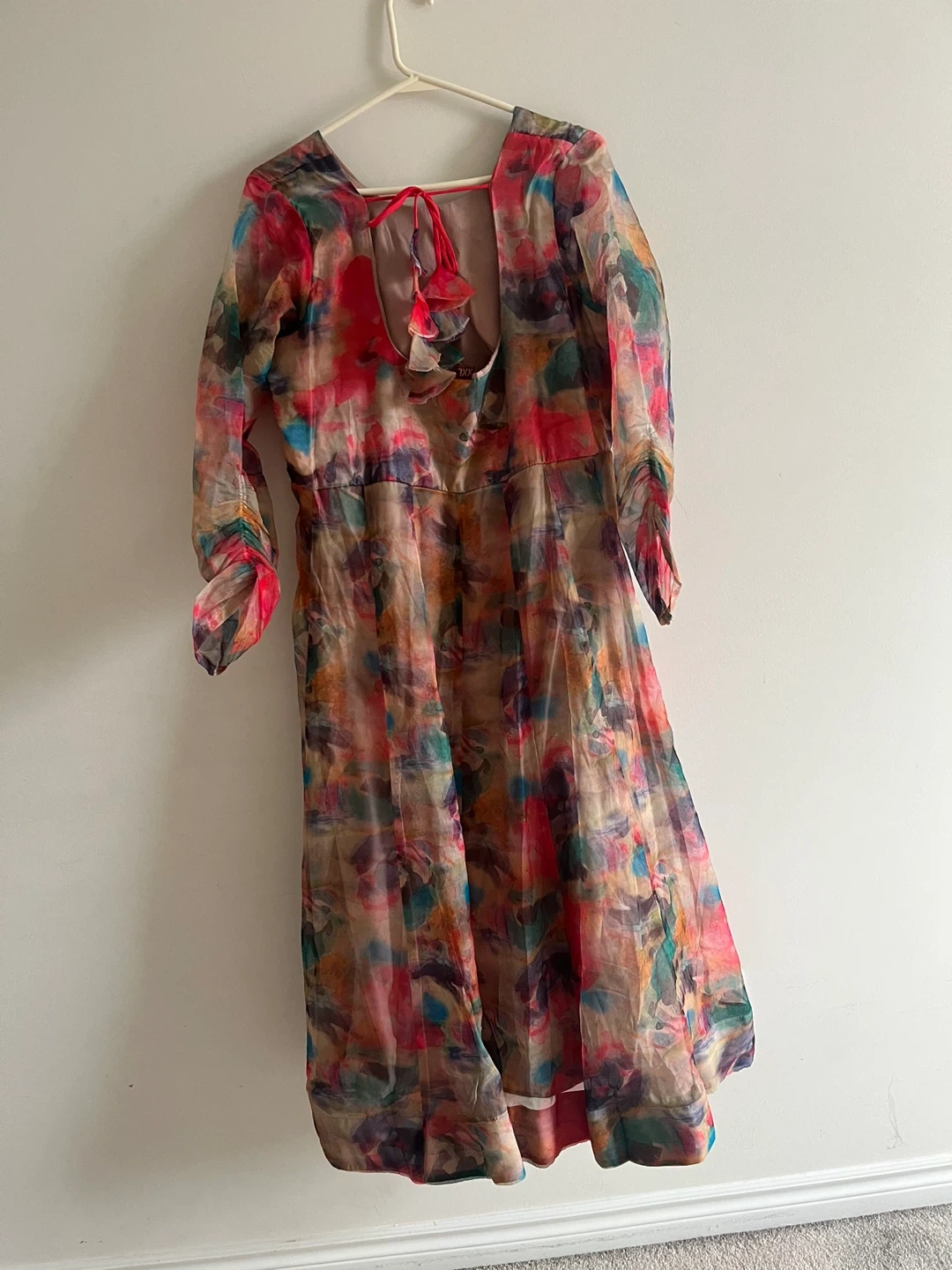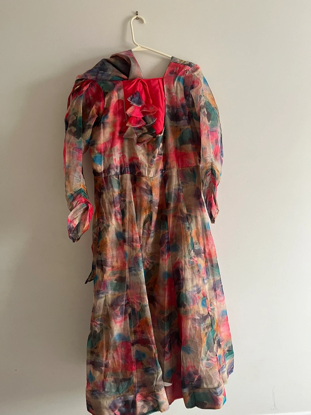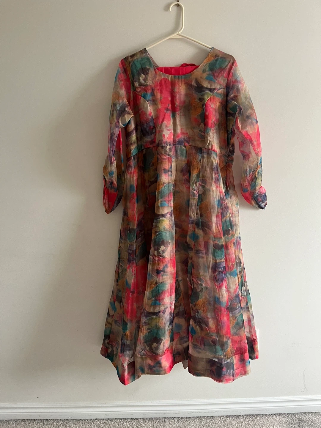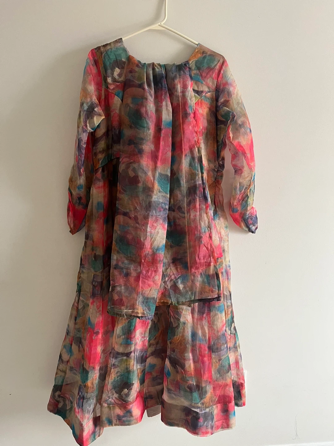 Flowy sheer Indian suit with a vibrant abstract print. It features long sleeves and a tie-back closure. Organza material. Size medium to large.