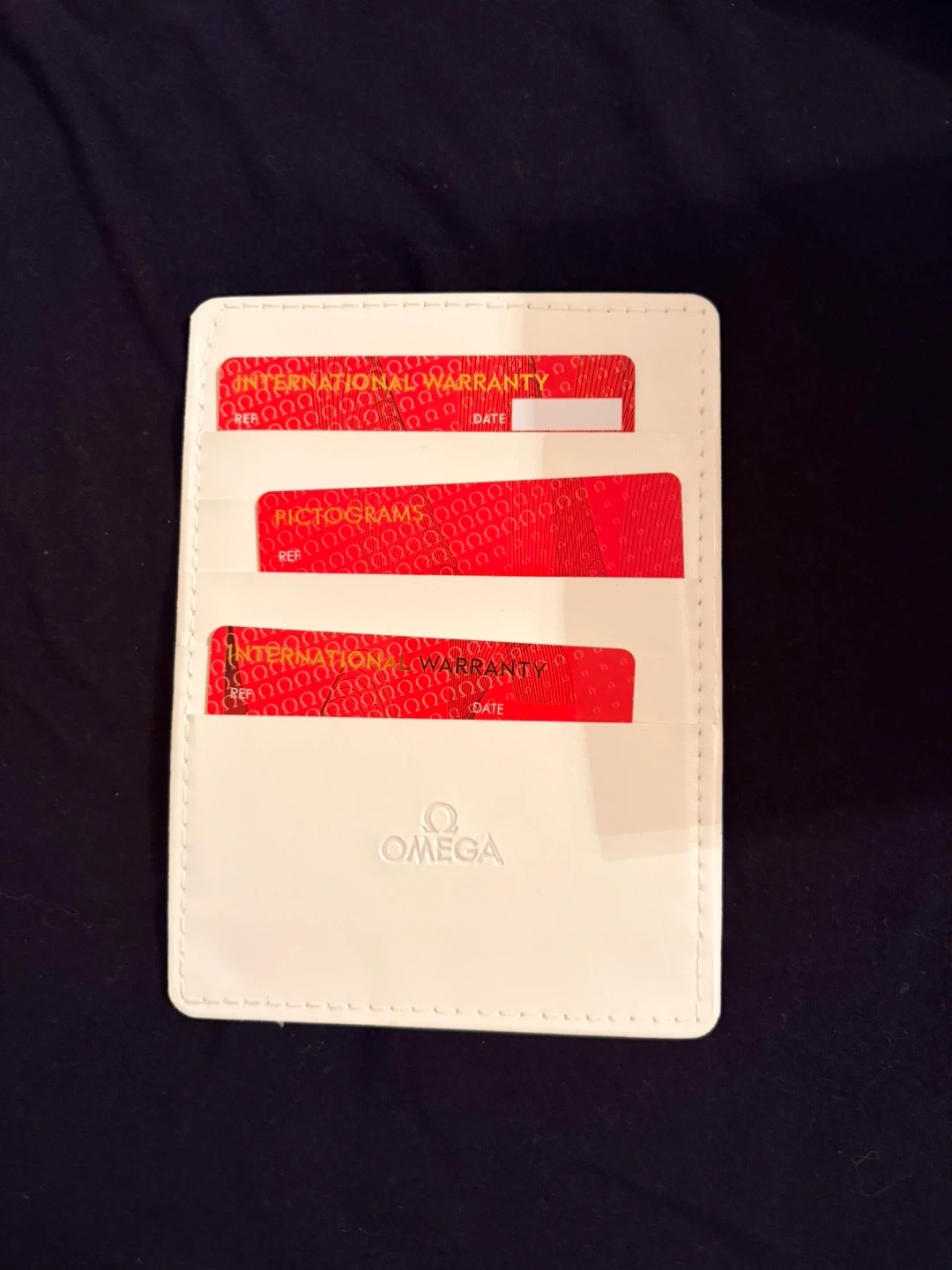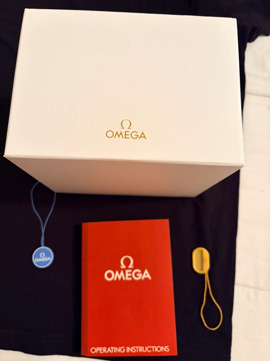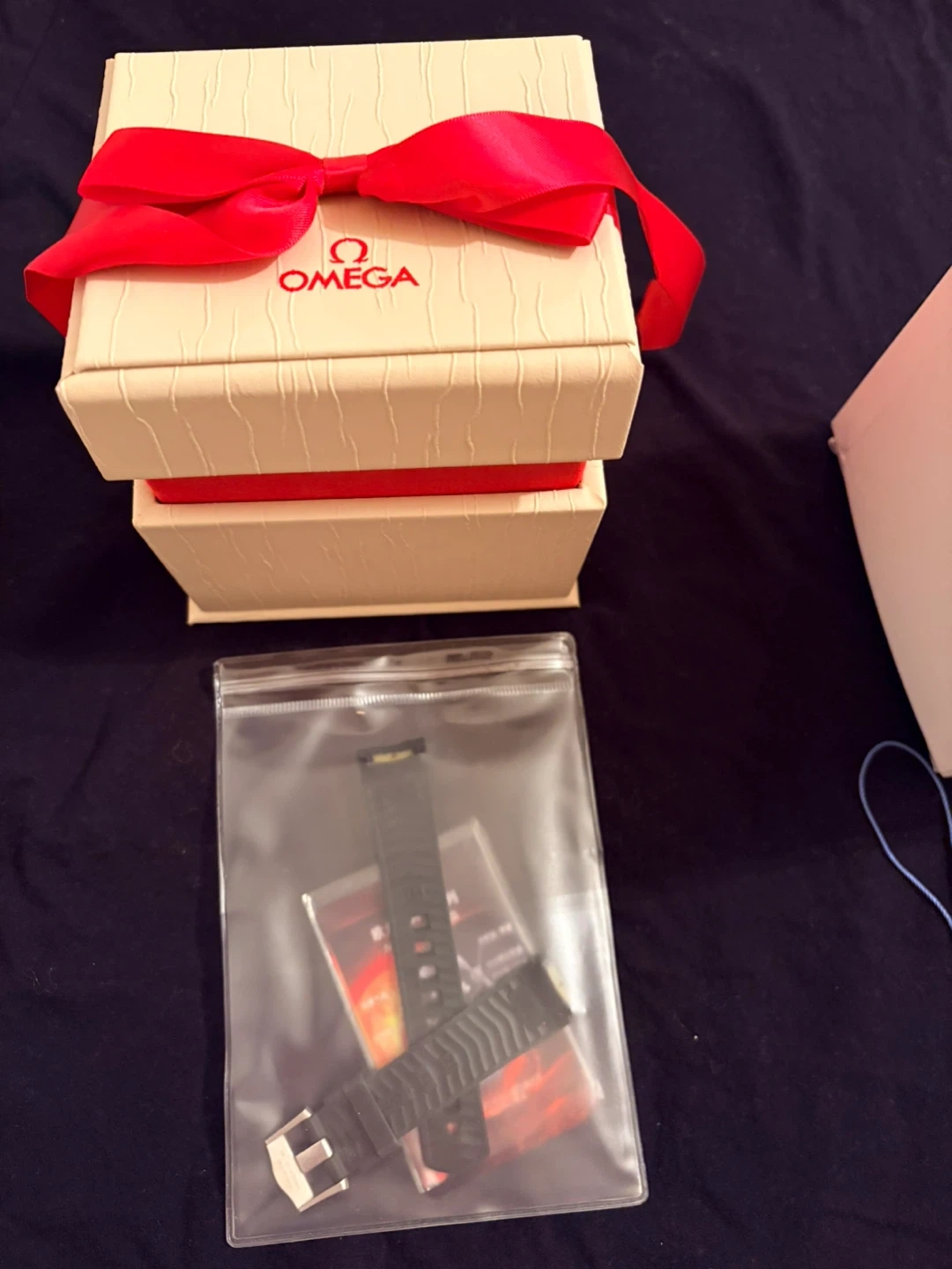 Pure 100% replica. Includes original Omega watch box, international warranty card holder, and extra watch strap. Operating instructions manual also present. Box is in excellent condition, tied with a red ribbon.