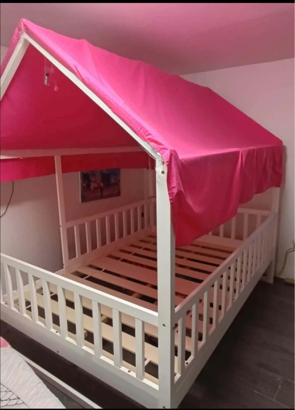 White wooden bed frame with a pink fabric canopy. Slatted base included. Sturdy construction for a child's room. This bed's unique design adds a playful touch to any kid's bedroom!