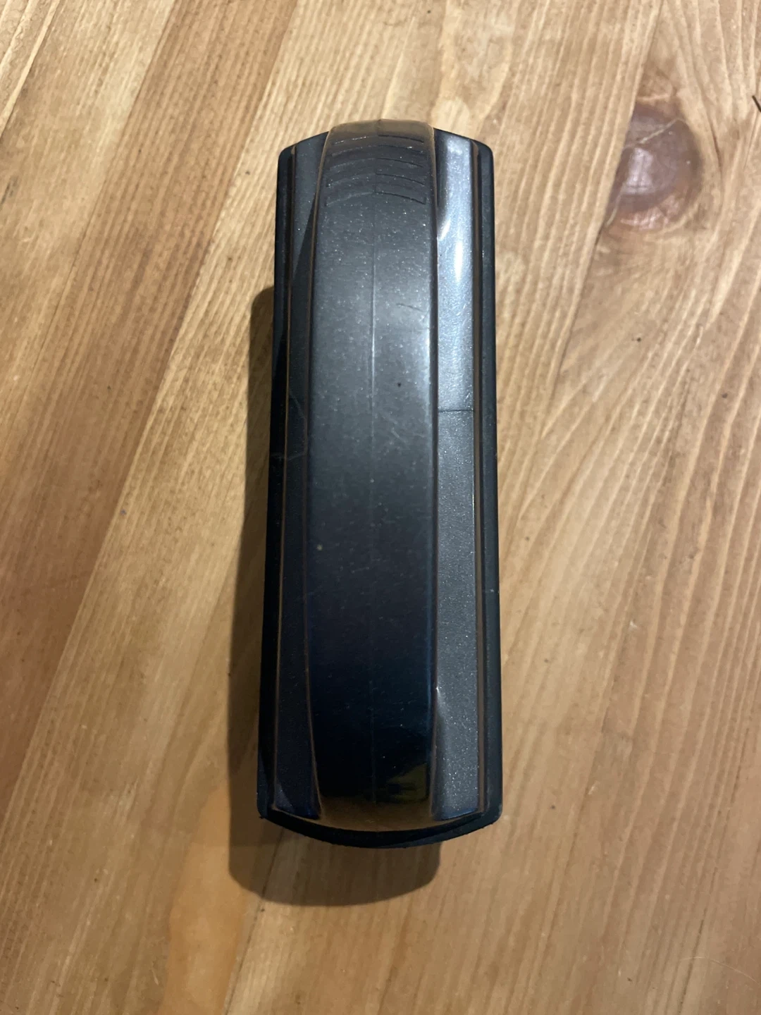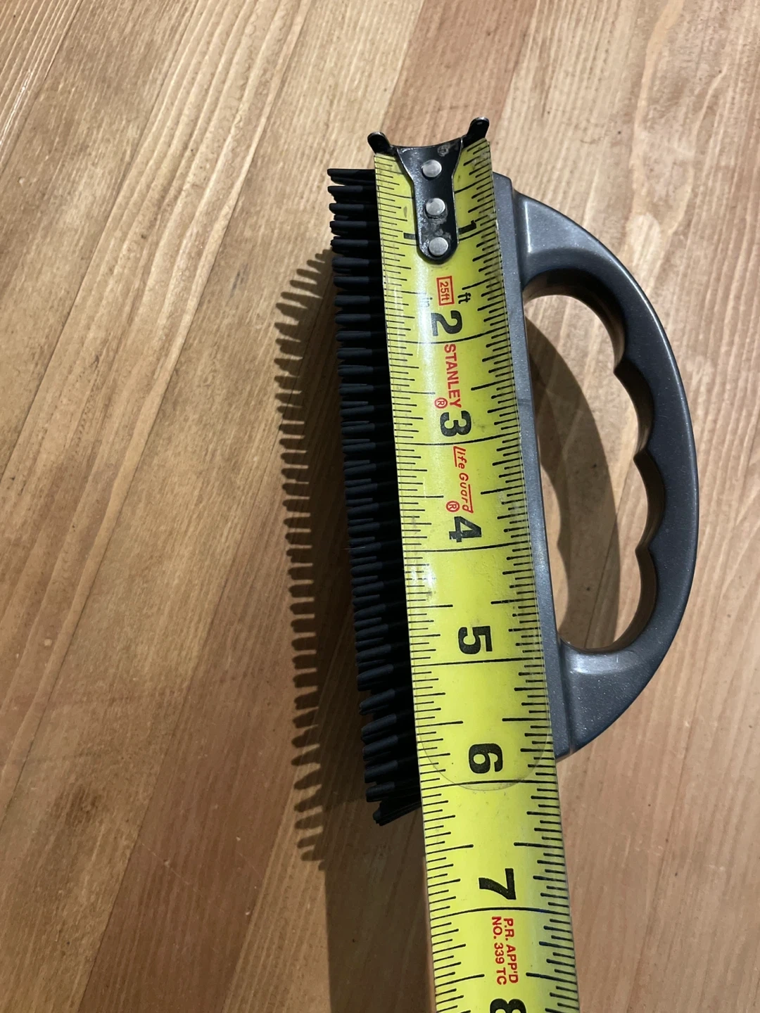 This scrub brush has stiff rubber bristles that are great for cleaning grout, tiles, and tough messes. It features a comfortable, ergonomic handle for easy grip. It's about 7 inches long.