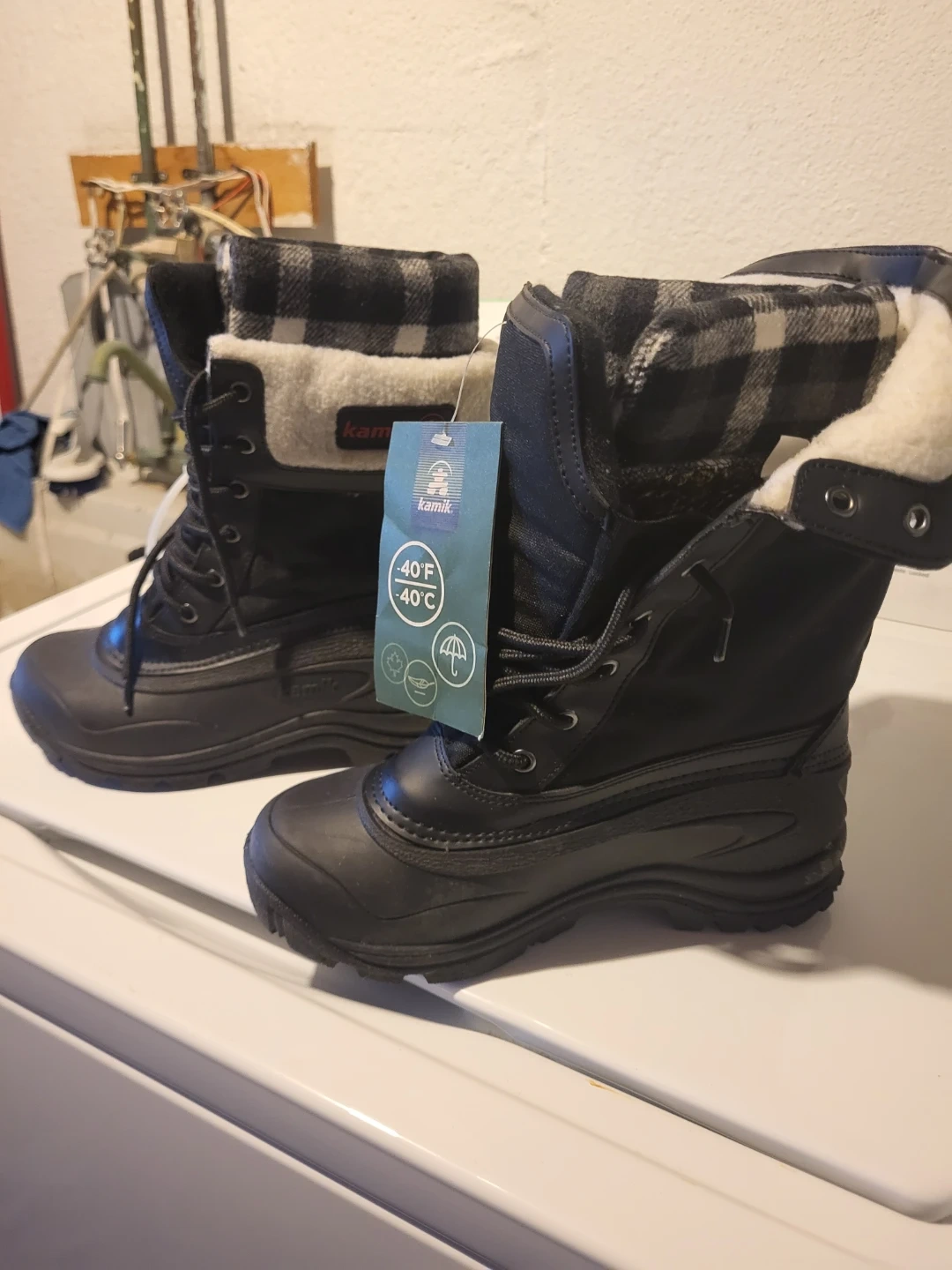 These Kamik winter boots are black with a plaid lining. They're rated for -40°F and are waterproof. They're built for cold weather conditions!