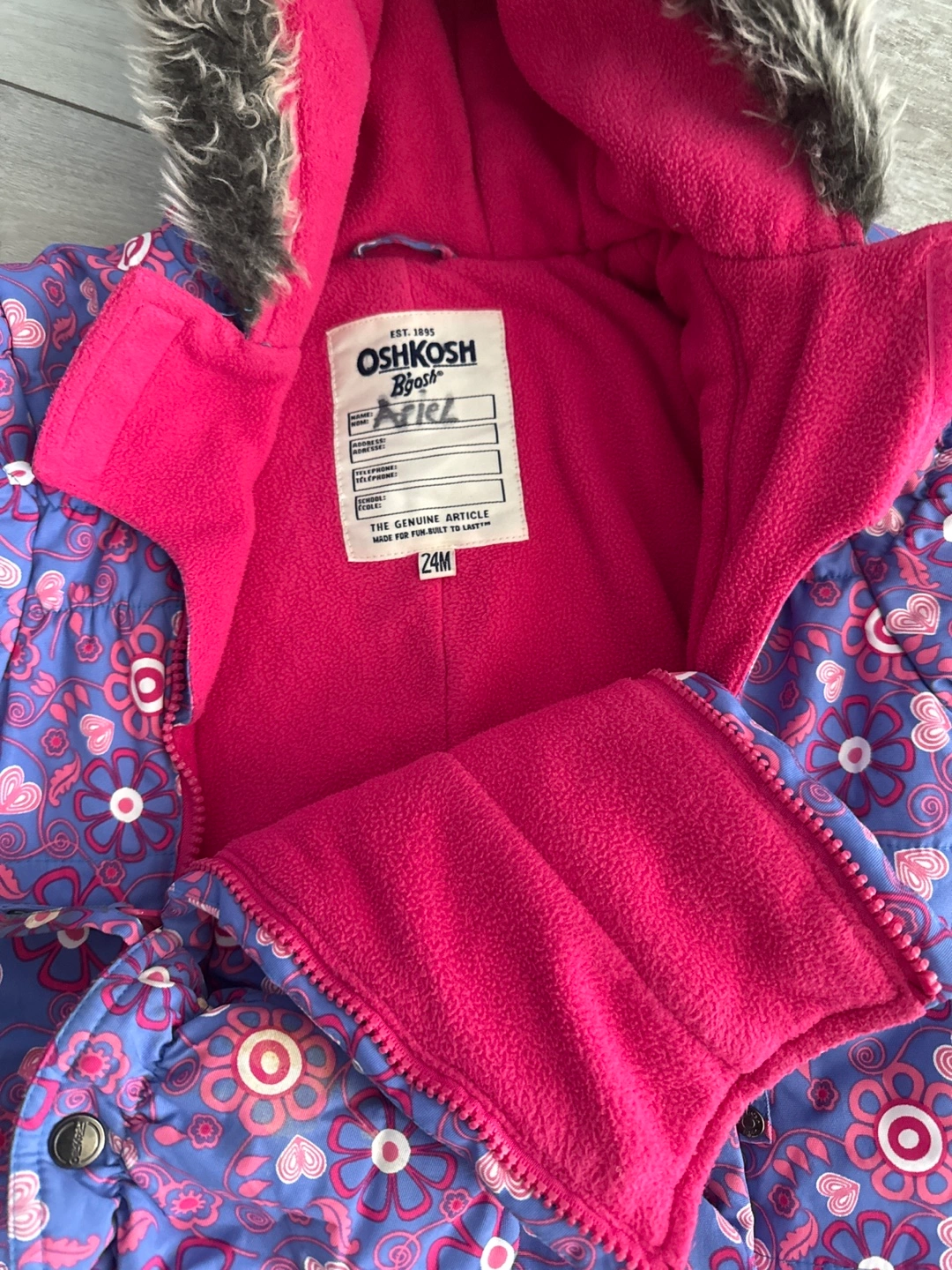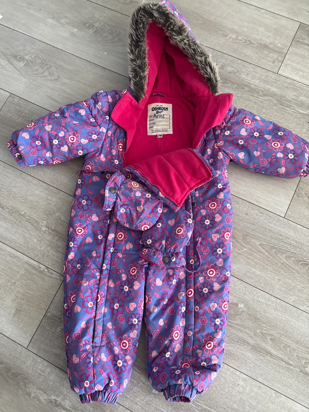 Selling OshKosh B'gosh snowsuit in size 24M! It features a floral pattern in shades of purple and pink, with a cozy pink fleece lining and a faux fur-trimmed hood, mittens included. Perfect for keeping your little one warm and snug during the winter months