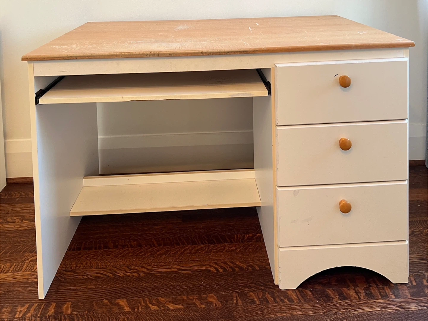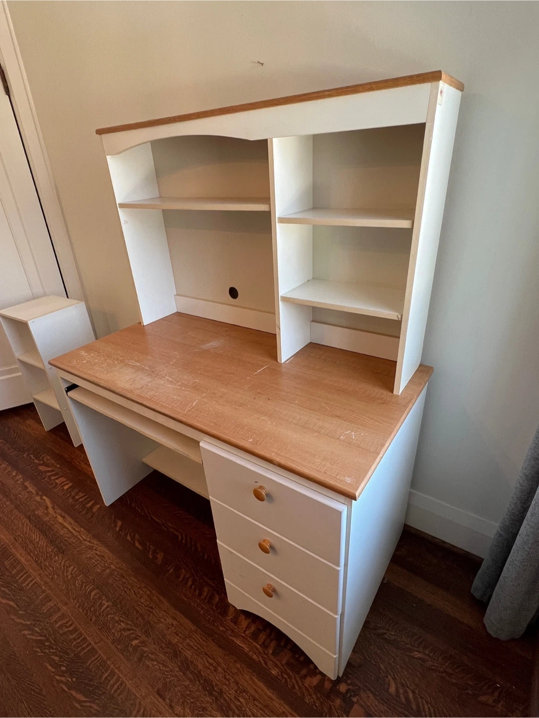 This desk has a pull-out keyboard tray and three drawers for storage. It also features a hutch with shelves for display or organization. The hutch is not attached and is removable. The desktop surface and tray show signs of wear.