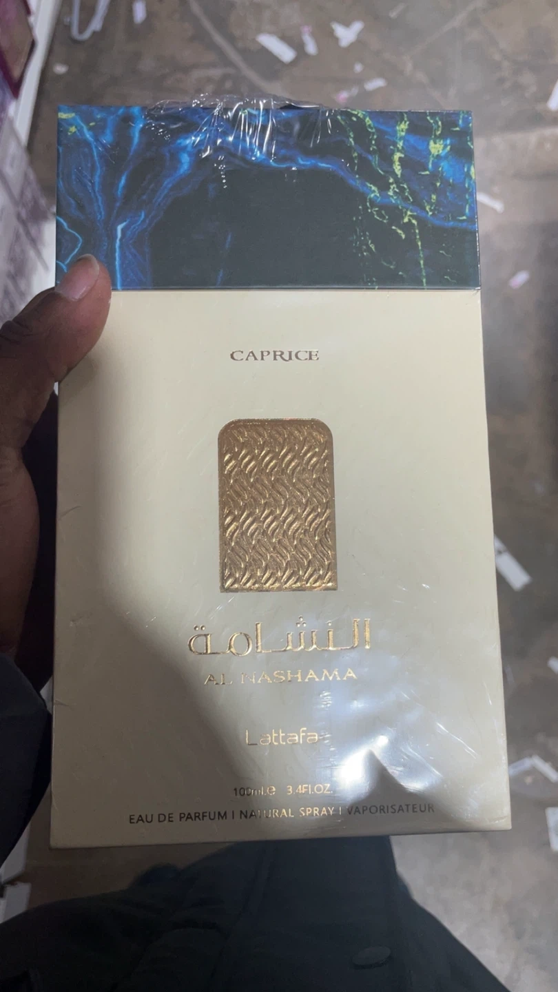 This is Lattafa Al Nashama Caprice Eau de Parfum. This scent has a fresh, spicy opening with a smooth and warm feel, after drying it is a clean woody-musky scent. An attention grabber