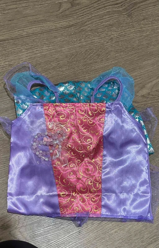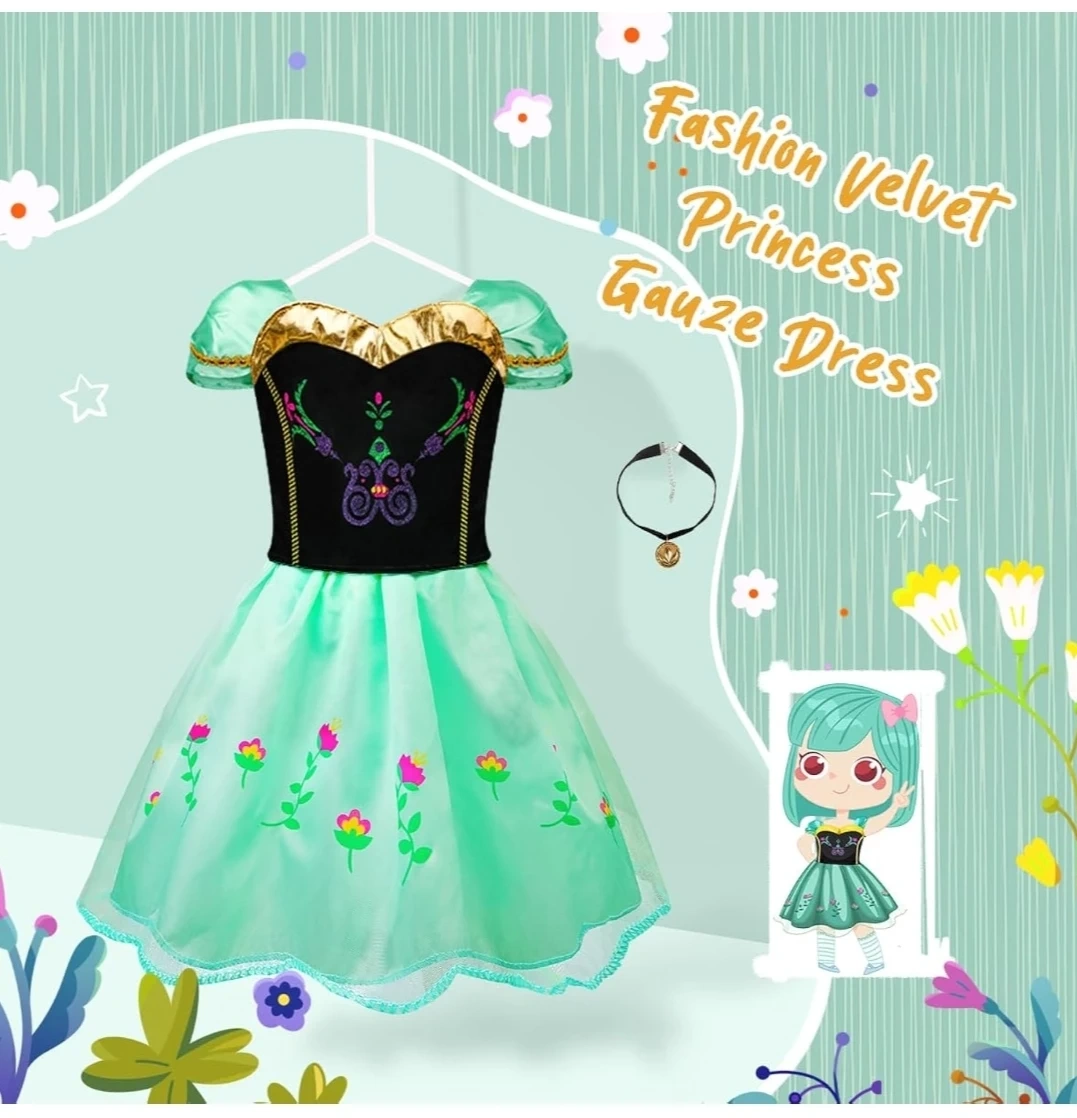 Beautiful Anna-inspired dress. Features black velvet bodice, teal skirt, and gold accents. Includes a necklace. Perfect for Halloween or dress-up.