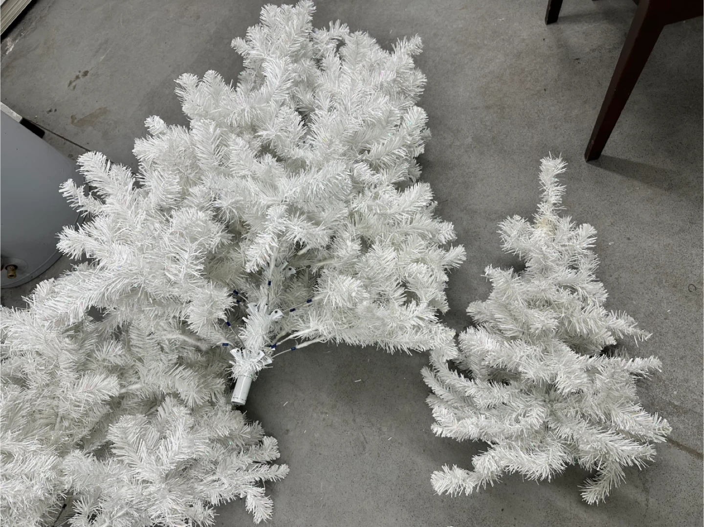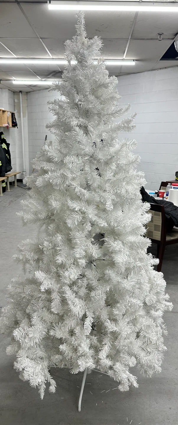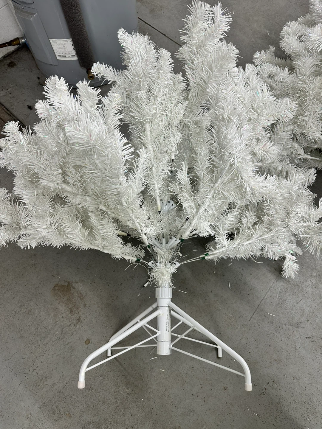 This is a white artificial Christmas tree. It's made of plastic and comes with a metal stand. It's perfect for creating a unique holiday display!