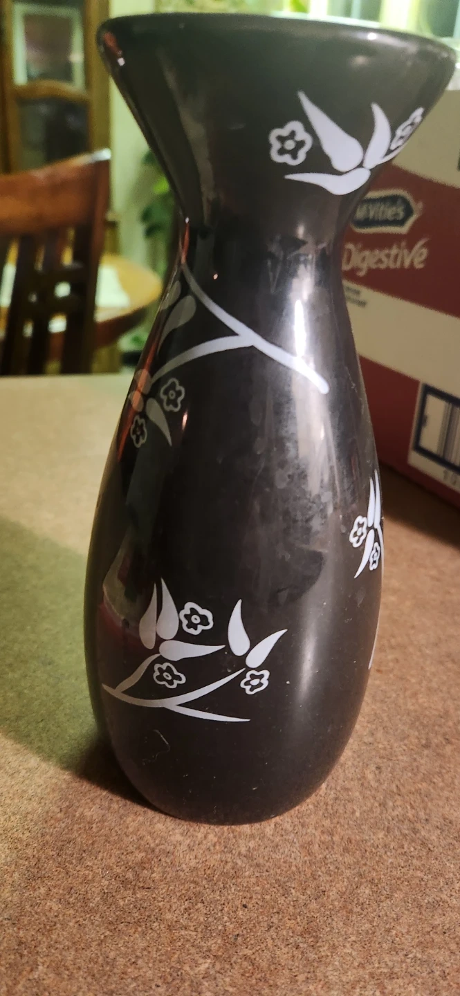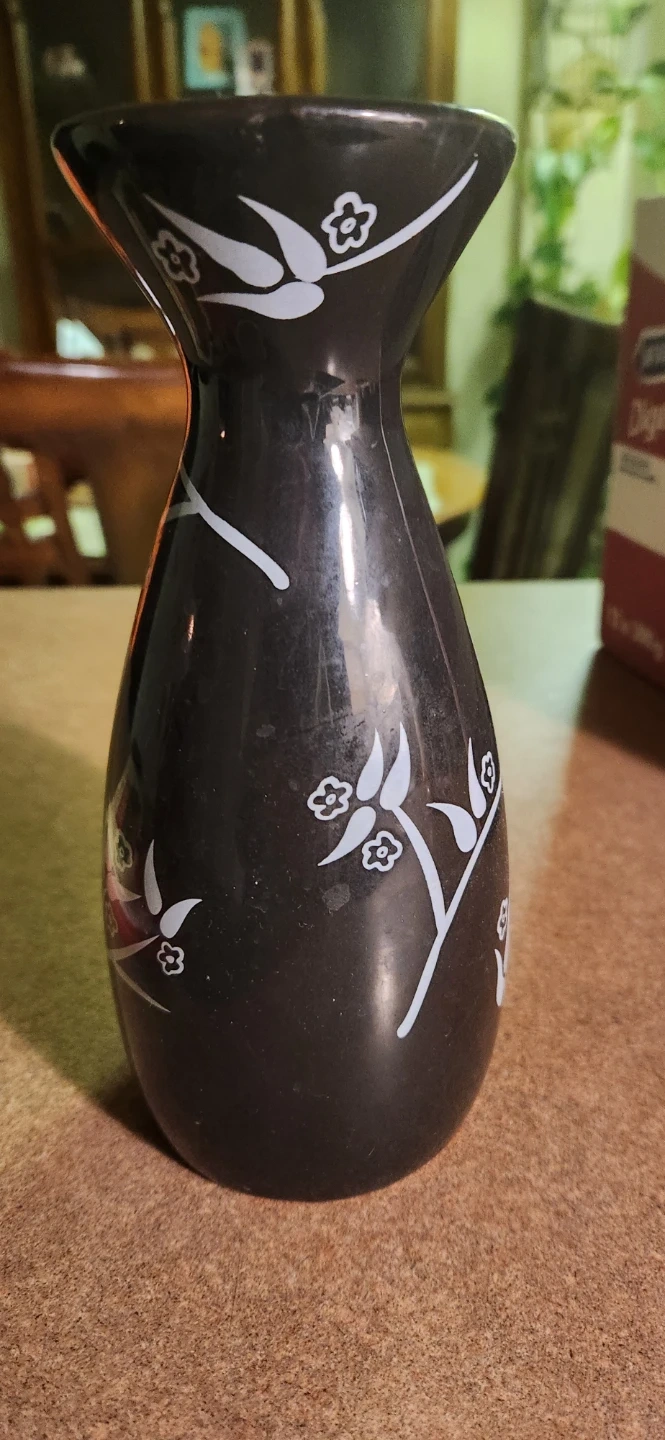 This is a black sake decanter featuring a delicate white floral and bird design. It's perfect for serving sake or as a small decorative vase. Use it to add a touch of elegance to your table!
