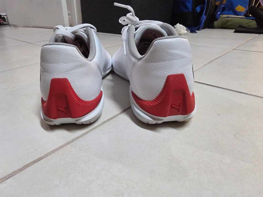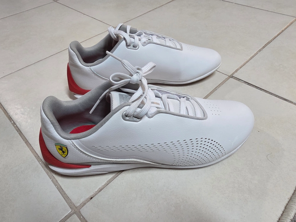 These white Puma Future Cat shoes feature red accents and the iconic Ferrari logo. They're crafted with synthetic leather for a sleek look. Perforated details add breathability. My kid just worn it couple of times. in good condition.