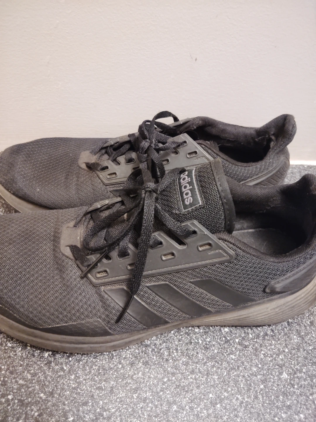 These are black Adidas running shoes. They feature a mesh upper for breathability. Laces are included. Size 9
