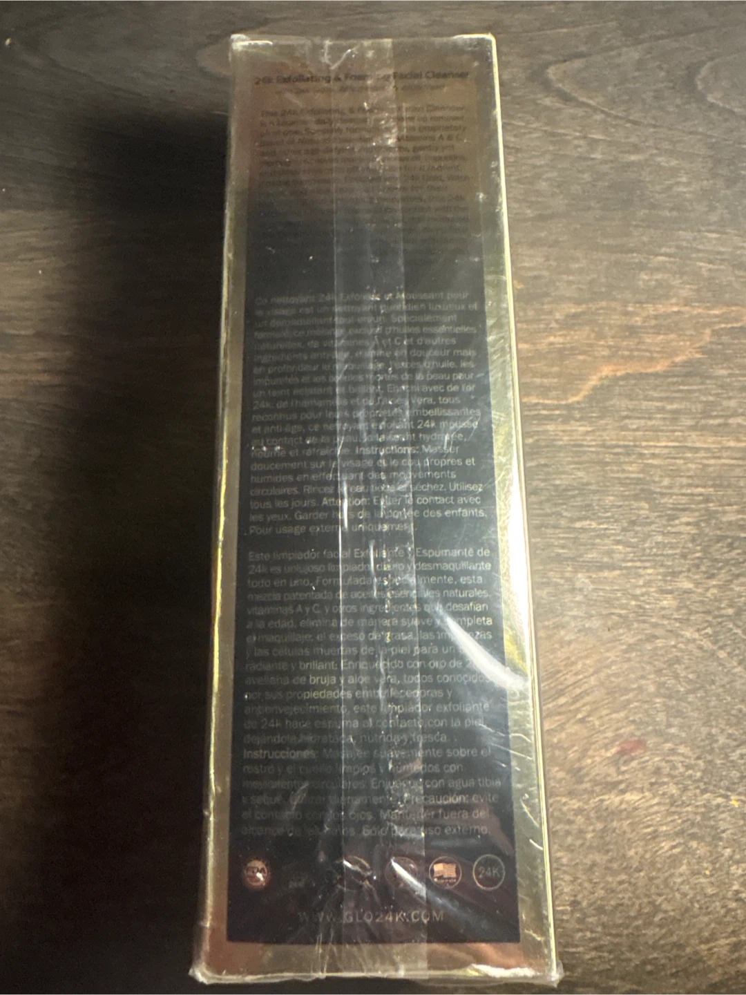 This is a Glo24k 24k Exfoliating & Foaming Facial Cleanser. It's 150ml or 5.07 oz. Contains 24k Gold, Witch Hazel, and Aloe Vera.