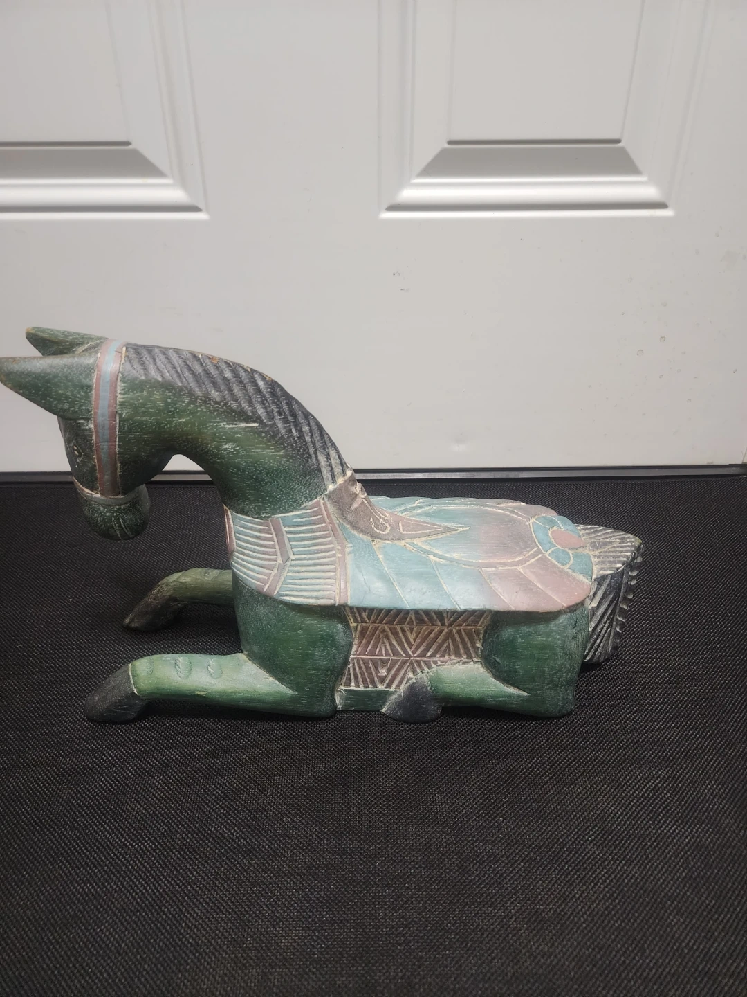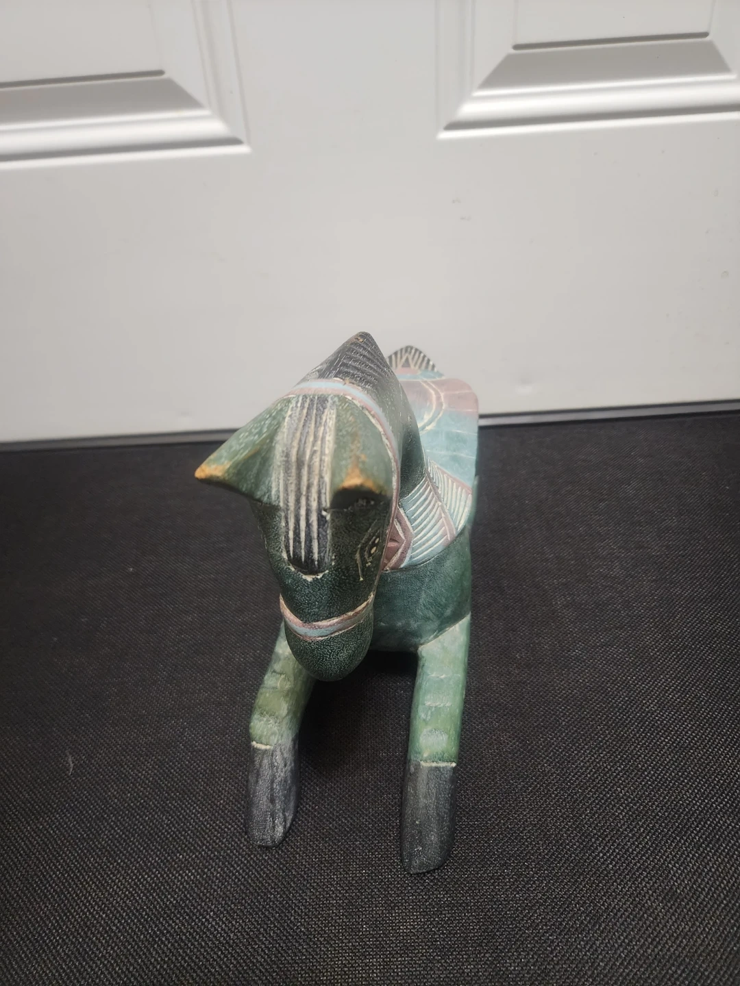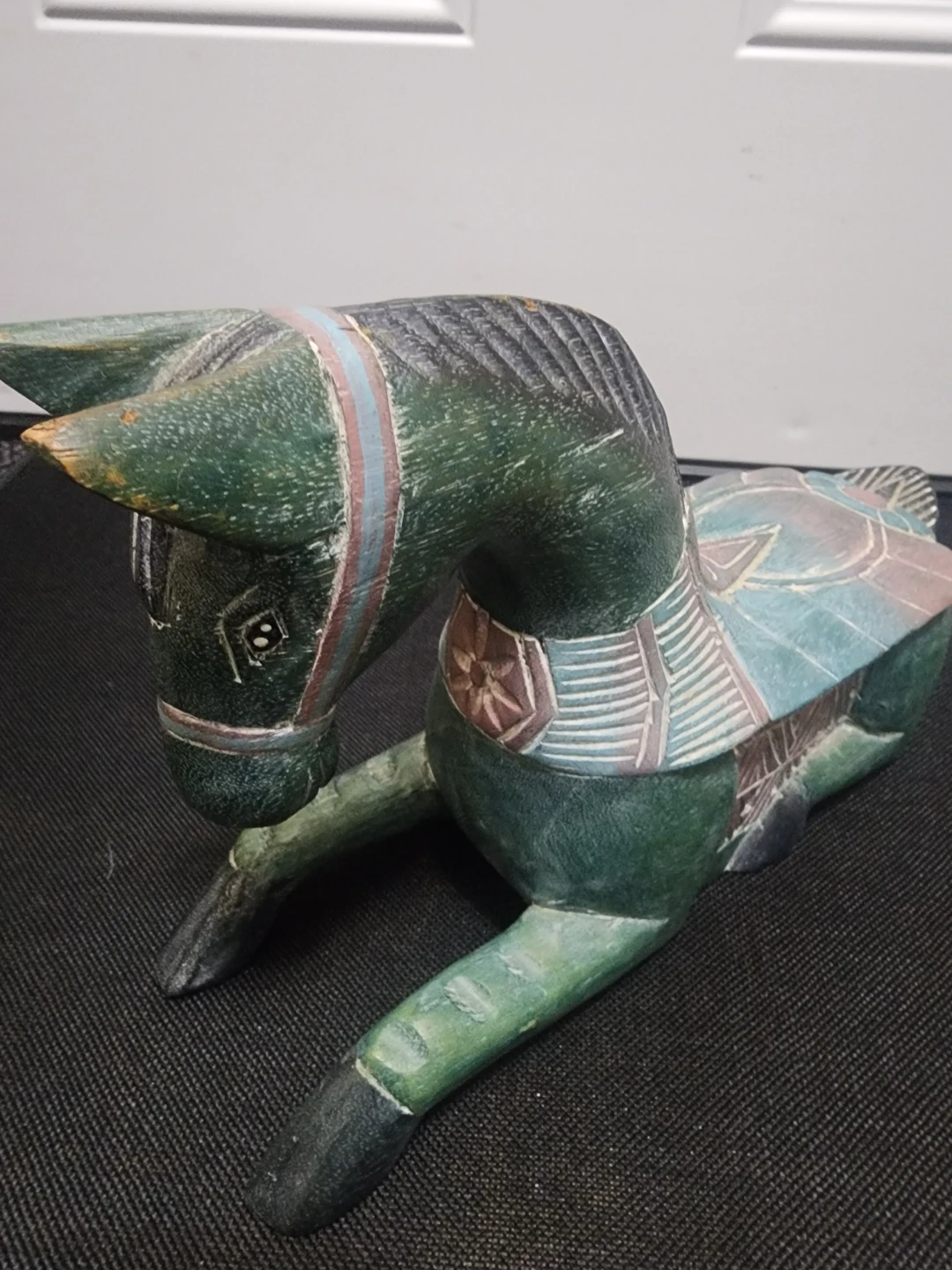 This is a charming hand-carved wooden horse figurine. It's painted a deep green with decorative patterns on its saddle and bridle. The intricate details showcase good craftsmanship.