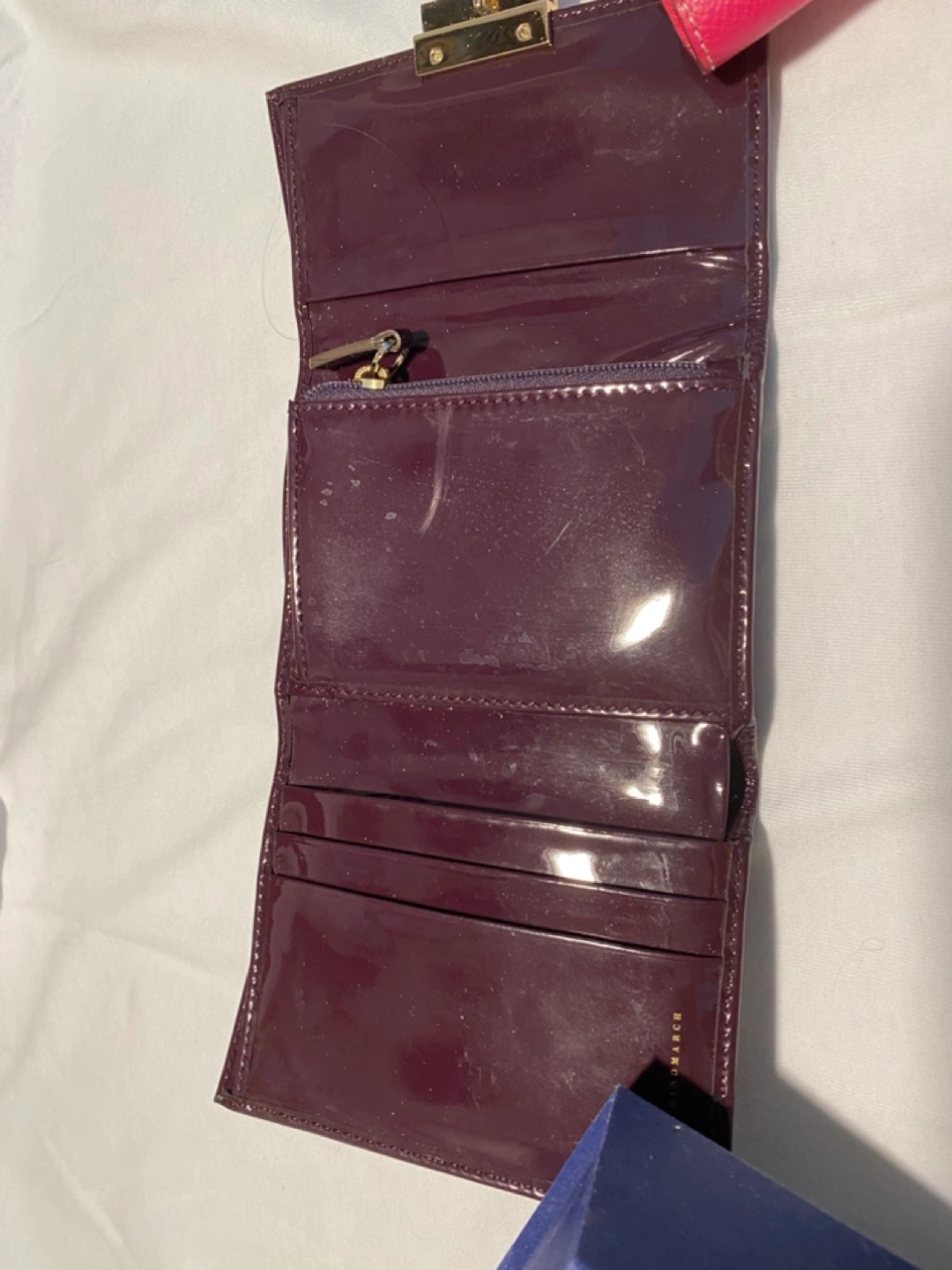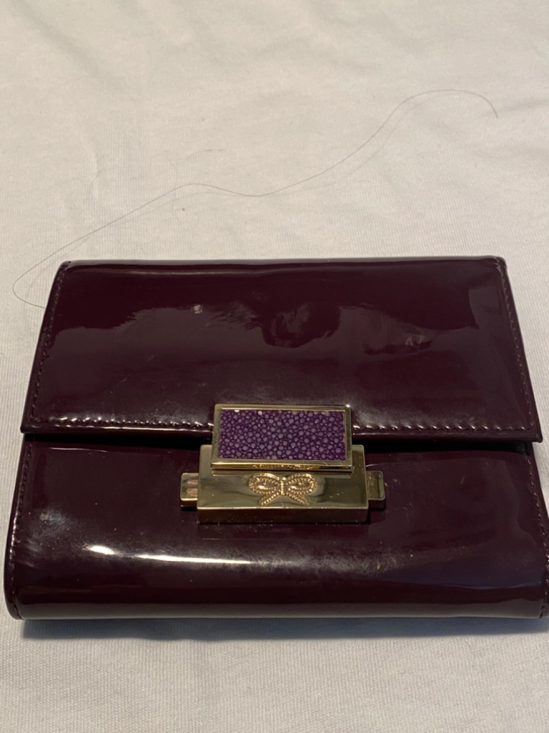 Wallet in a shiny, deep purple colour. Features a gold clasp. Offers several compartments inside. This wallet is perfect for carrying your essentials safely and securely, creating a sense of peace of mind.