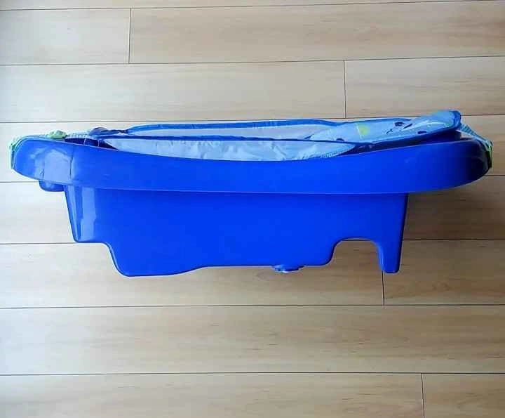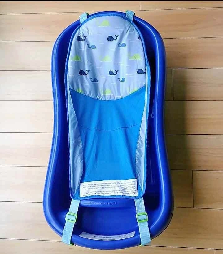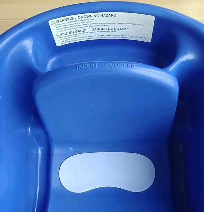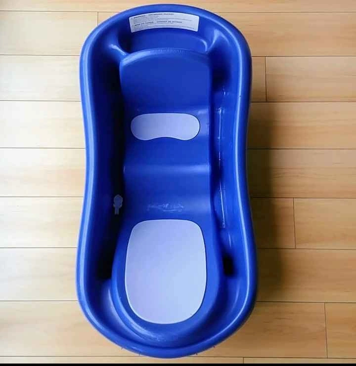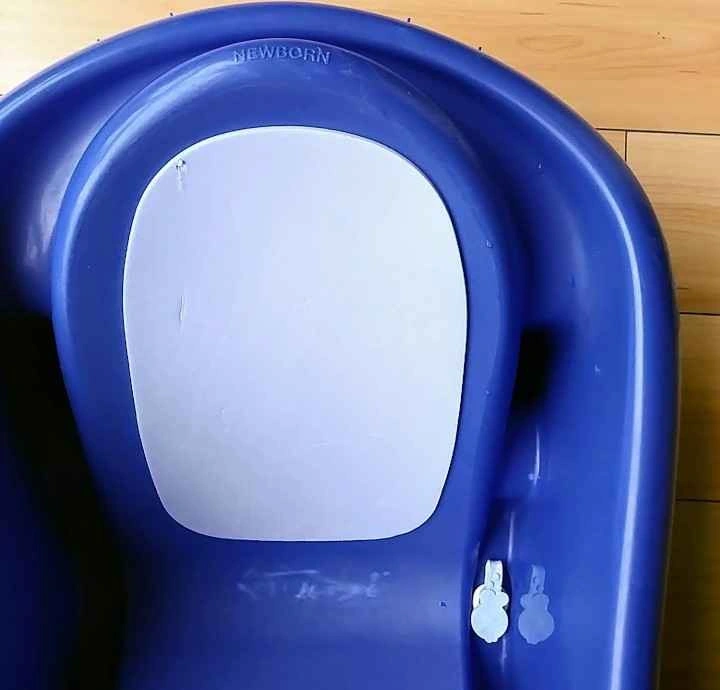 Baby infant to toddler bathtub and hooded towel. Excellent condition. Has a stopper to empty water. Blue. Designed for security, comfort, and convenience for parents and growing babies. Fits single and double sinks. Includes newborn mesh sling, padded infant recline, and padded toddler upright position. Built-in storage area for bath supplies or rinse basin. From birth and up. Brand: The First Years. From a non-pet and non-smoking home. Cash and exact change only. Pick-up only in the West end.