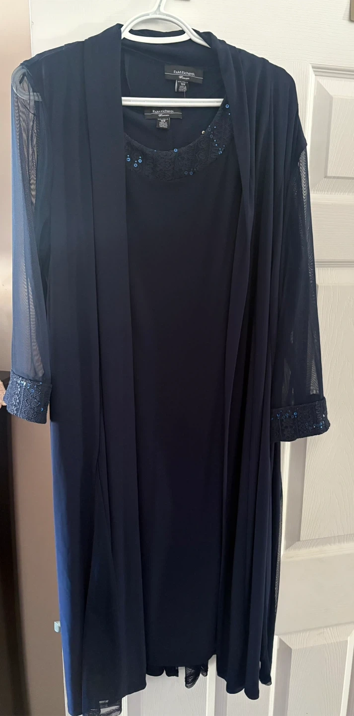 This R&M Richards navy blue dress comes with a matching sequined overlay. The dress features beaded accents on the neckline and cuffs. It's a size 16W. Perfect for special occasions!