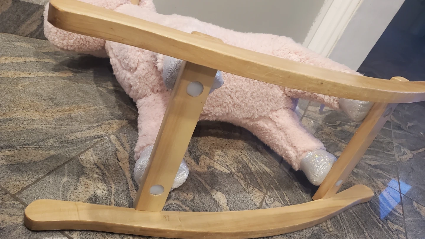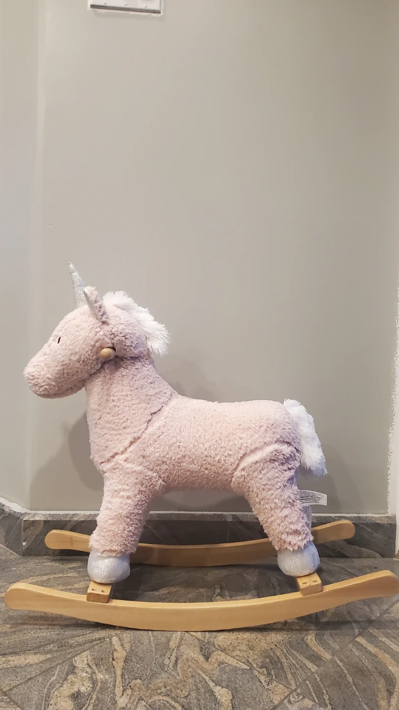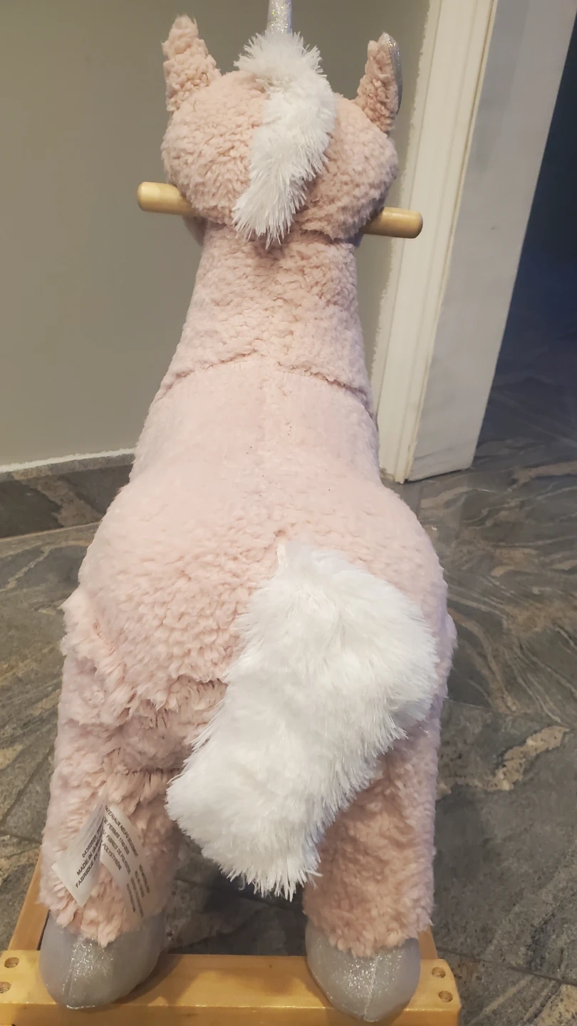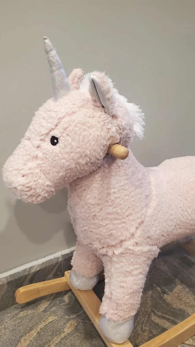 This adorable pink plush unicorn rocking horse features a sparkly horn and ears. It's built on a sturdy wooden rocking base. This toy is sure to be a favourite for imaginative play!