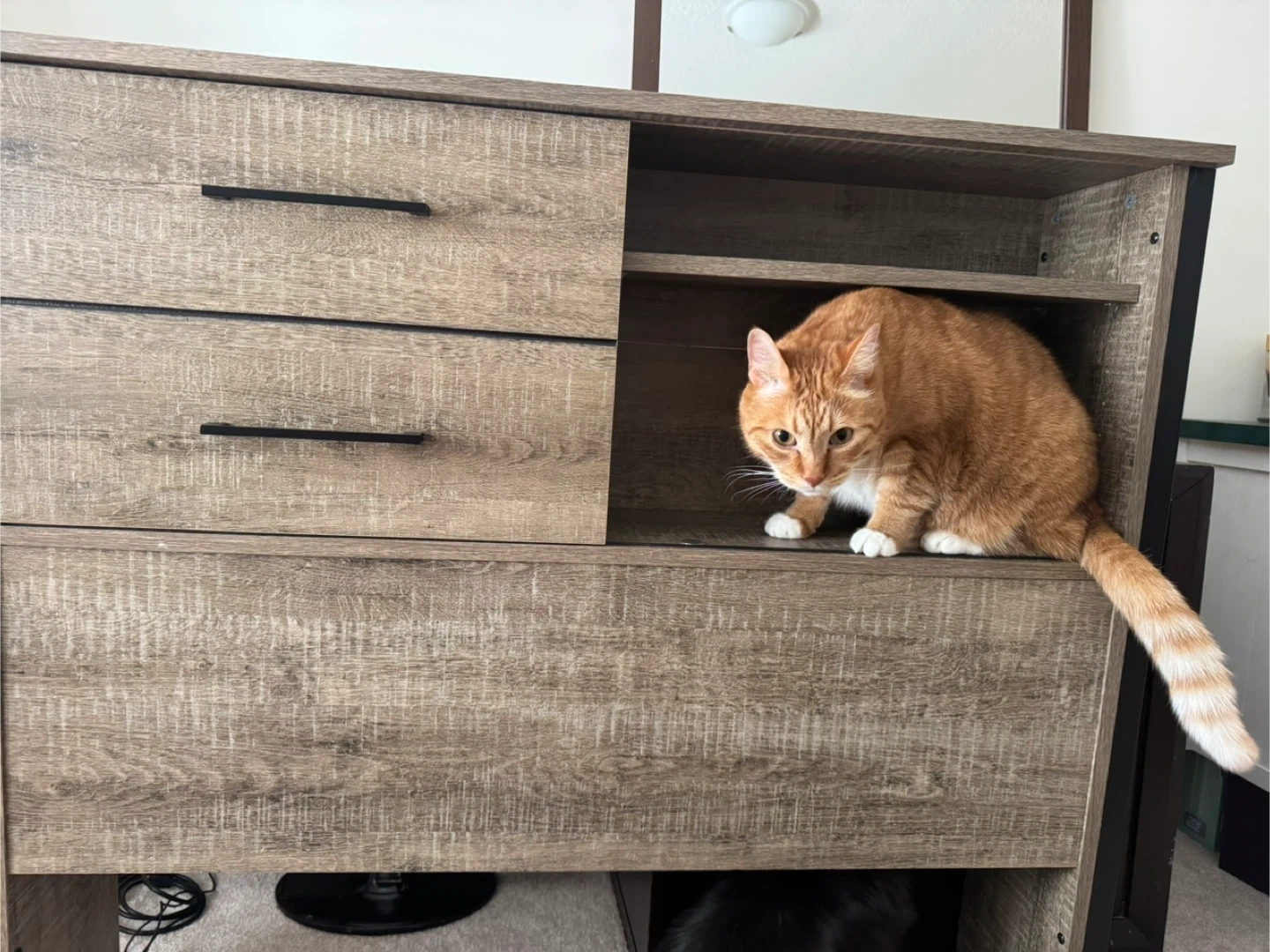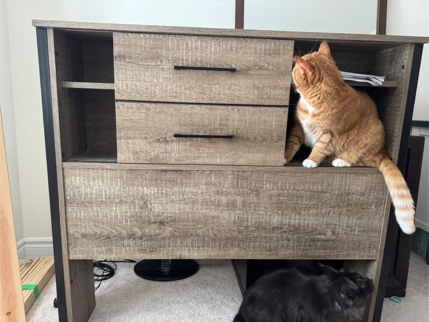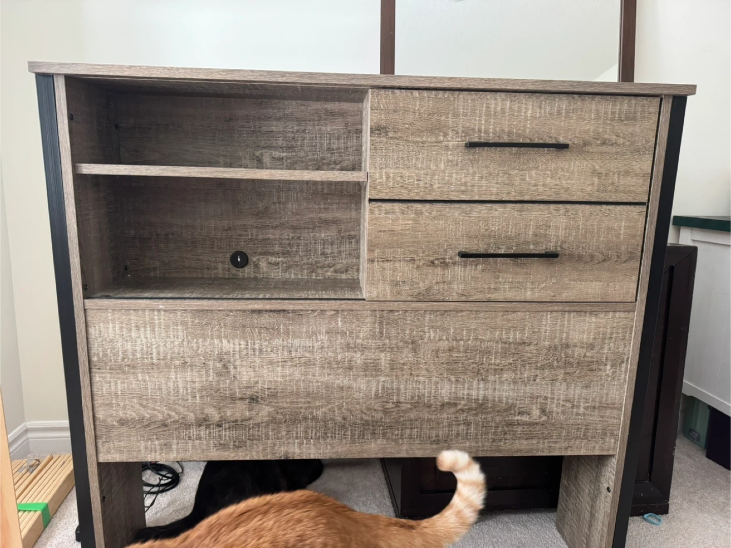 This twin bed headboard a rustic wood finish with black metal accents. It includes two spacious sliding and open shelving. Already Assembled & light weight!