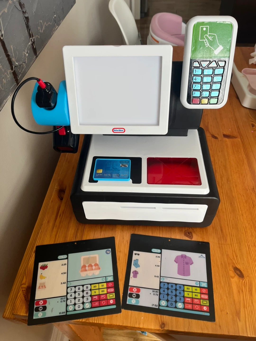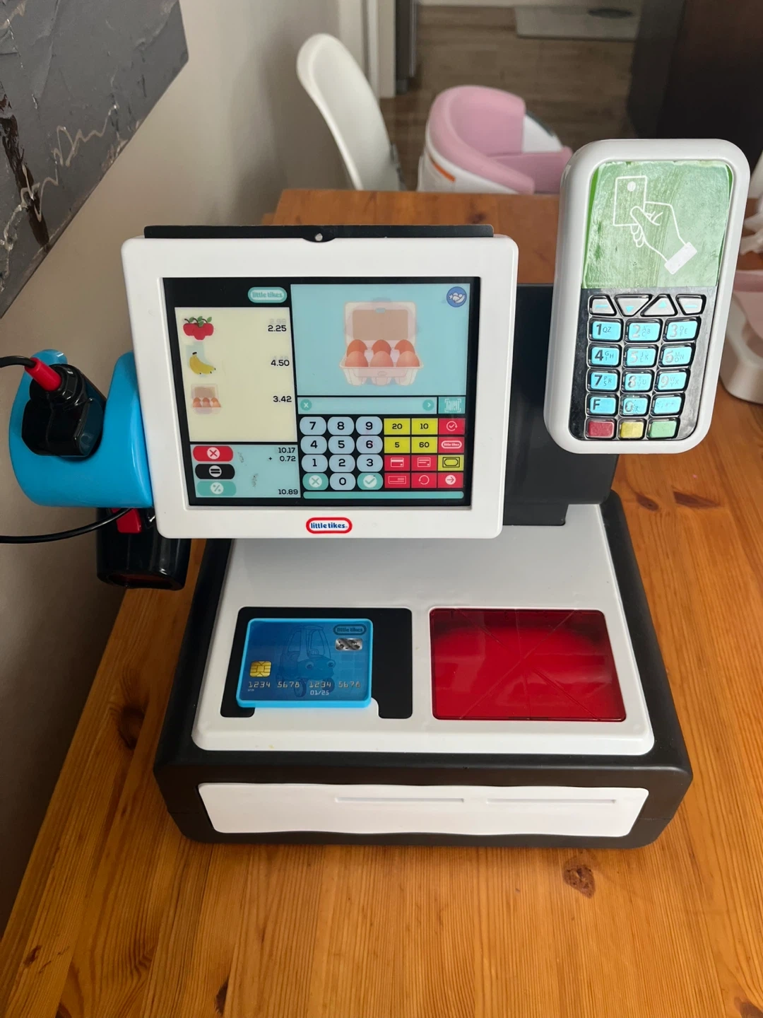 This Little Tikes electronic cash register comes with a scanner and accessories for pretend play. It features a working calculator and card reader for fun shopping simulations. Great for developing early math and social skills in kids!