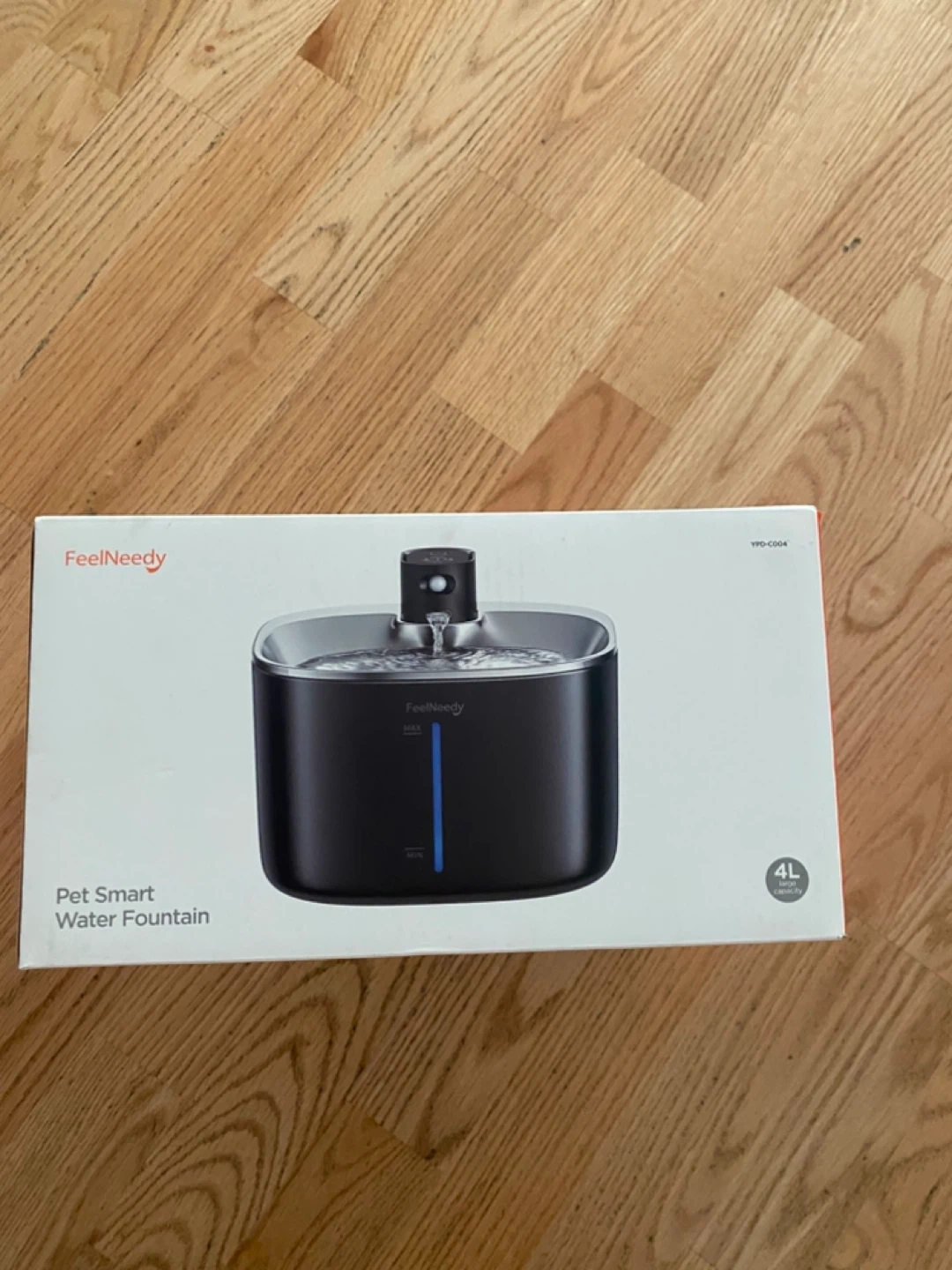 This is the FeelNeedy Pet Smart Water Fountain with a 4L capacity. It's designed to provide fresh, filtered water for your pets. The unit includes the fountain, power adapter, and filter.