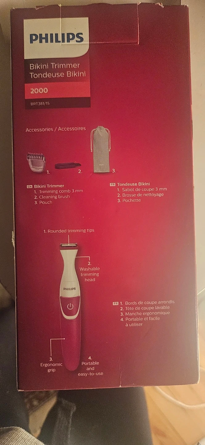 This Philips bikini trimmer comes with a 3 mm trimming comb, cleaning brush, and a pouch. It features rounded trimming tips and a washable trimming head for easy use. The ergonomic grip makes it portable and easy to handle.