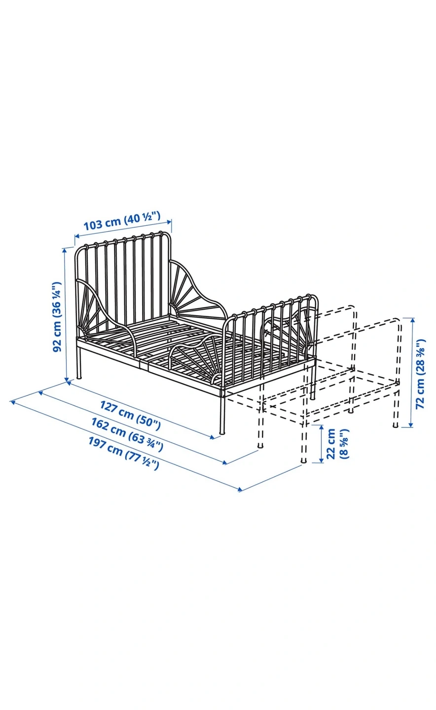 This pink metal twin bed frame features a charming fan-like design on the headboard and footboard. It includes a sturdy wooden slat base for mattress support. Overall dimensions are 197 cm (77 ½") long and 103 cm (40 ½") wide.