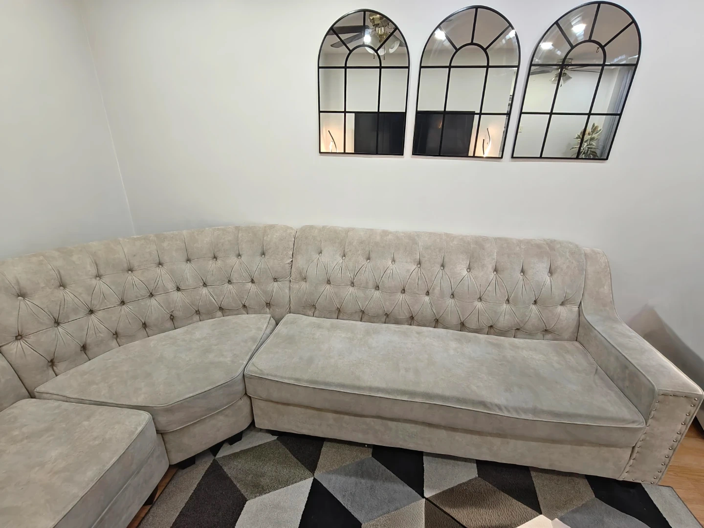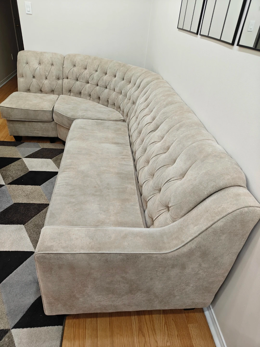 Selling a sectional sofa in a neutral beige colour! It's in great shape and would be perfect for a living room or den. The dimensions are 121 inches by 66 inches, with a seat depth of 36 inches. It features a stylish tufted design.