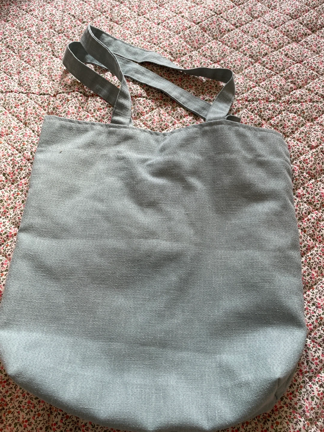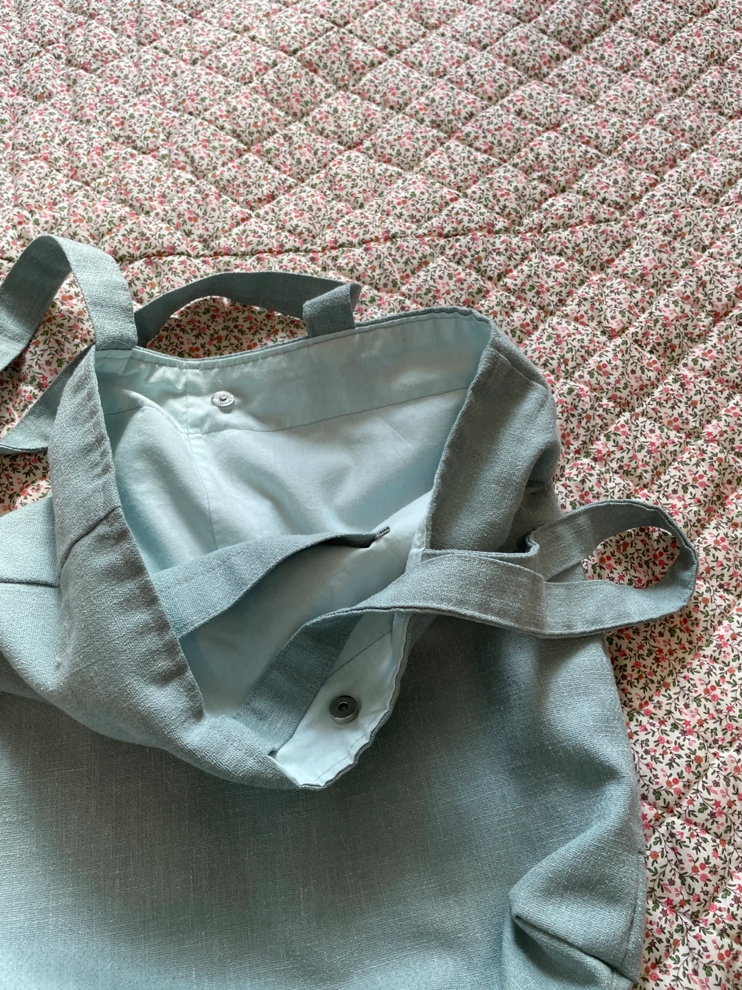Light blue canvas tote bag with two front pockets and a snap closure. It has an interior lining and two comfortable shoulder straps. This bag is great for everyday use!
