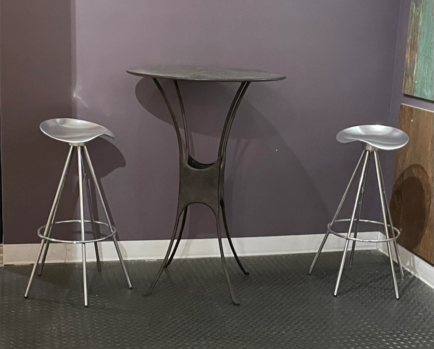 Round bar table with two silver metal bar stools. The table has a dark grey metal finish and a unique pedestal base. Each stool features a contoured seat and a three-legged design with a footrest ring. It's a great set for a home bar or kitchen nook!
