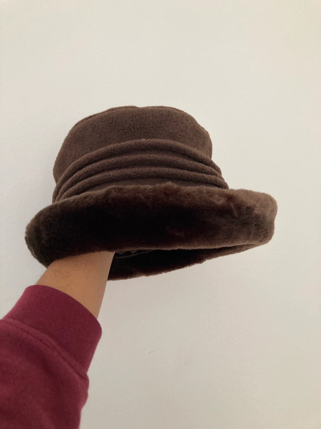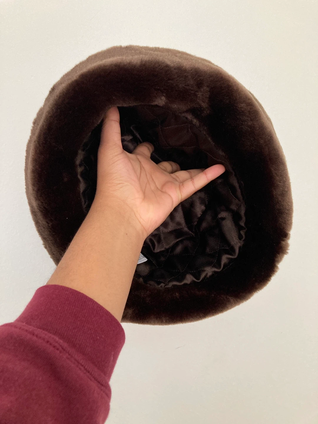 Cozy brown bucket hat with a plush faux fur exterior and a satin lining. It features a gathered band detail. Great for staying warm and stylish on chilly days!