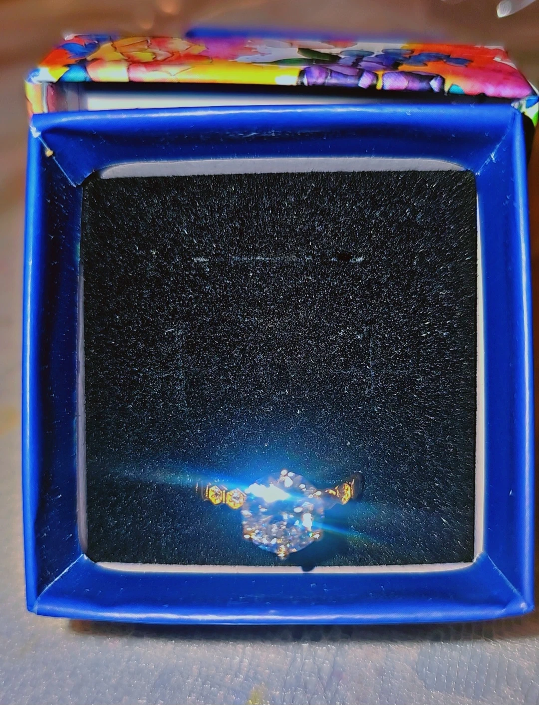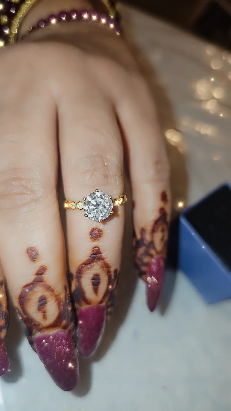This ring features a large moissanite diamond gold-toned S925 silver ring . It has a delicate band with small decorative accents..Sparkly gold tone Moissanite diamond ring s925 silver gold plated, Solitaire diamond really catches the light. Small details on the band too. Comes with a gift box.
