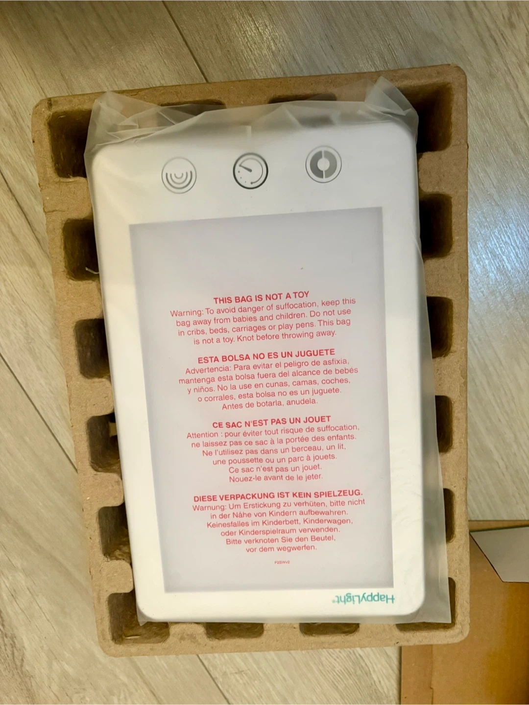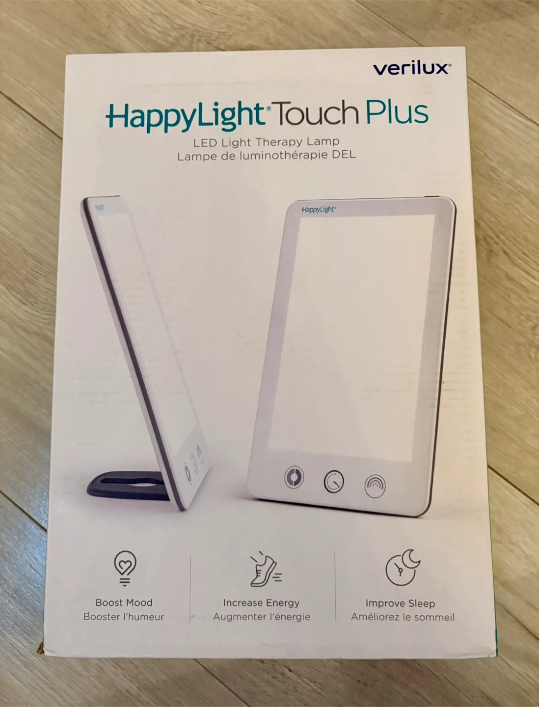 This is a Verilux HappyLight Touch Plus LED Light Therapy Lamp. It comes with the lamp, a power cord, and instruction manuals.