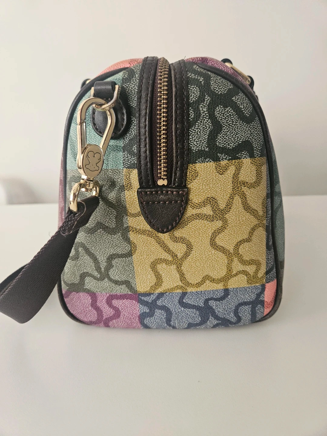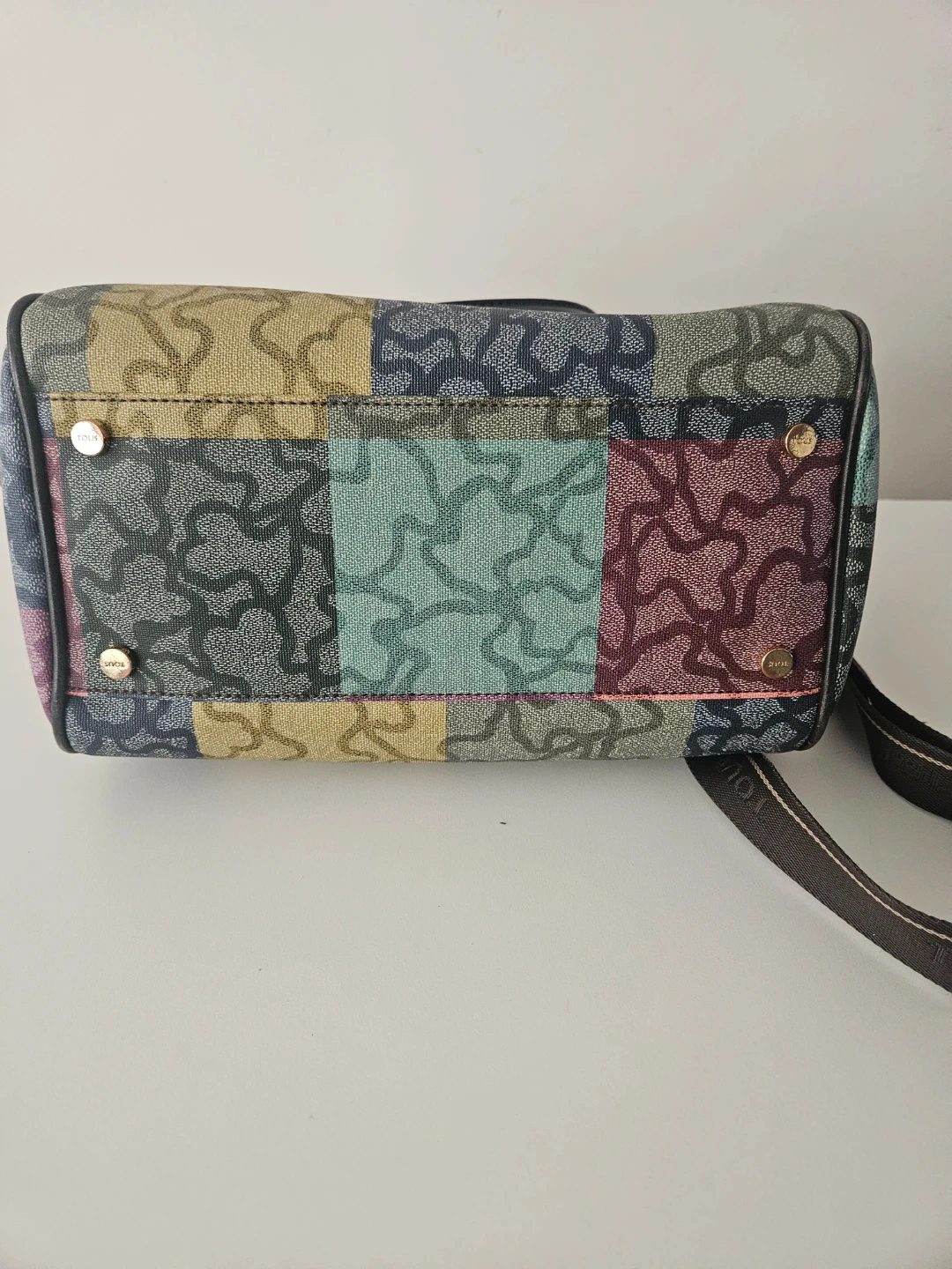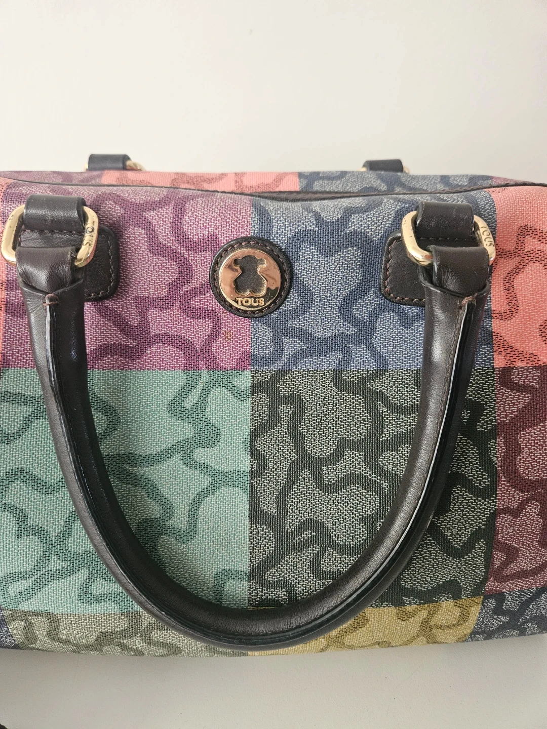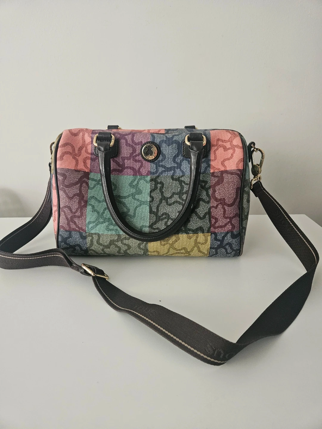 This Tous satchel bag features a colourful patchwork design with the signature bear logo pattern. It has leather handles and a removable shoulder strap. This bag is made with durable canvas material. It's perfect for everyday use!