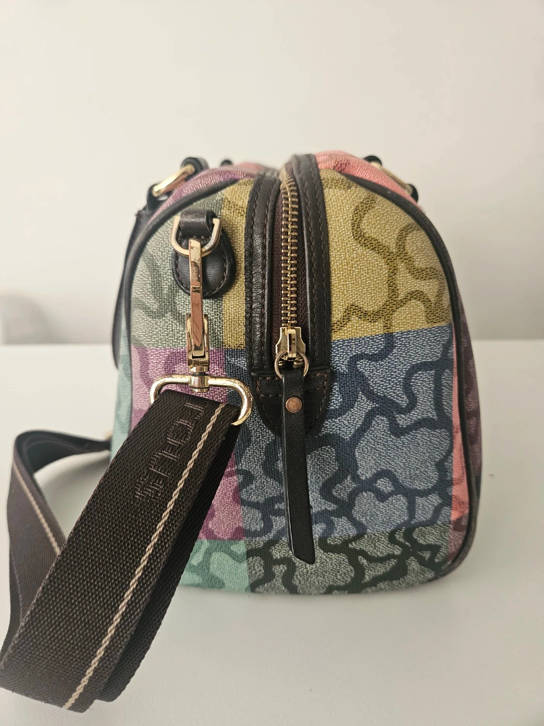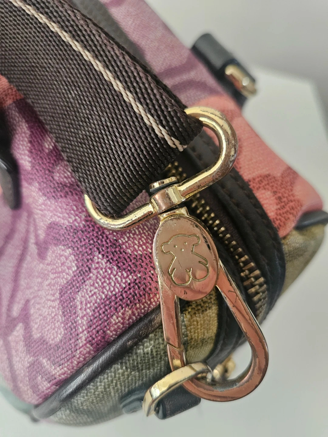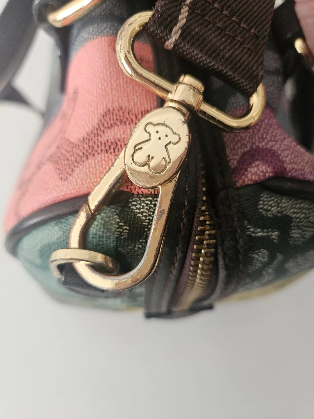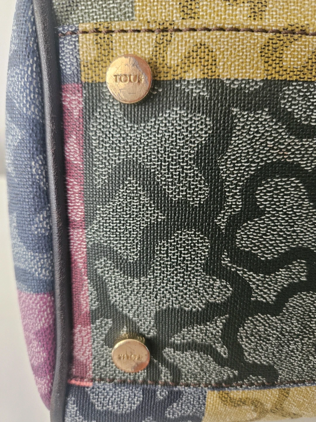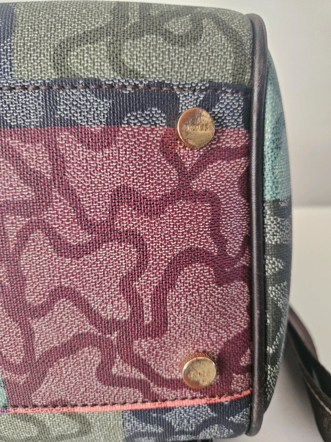 This Tous satchel bag features a colourful patchwork design with the signature bear logo pattern. It has leather handles and a removable shoulder strap. This bag is made with durable canvas material. It's perfect for everyday use!