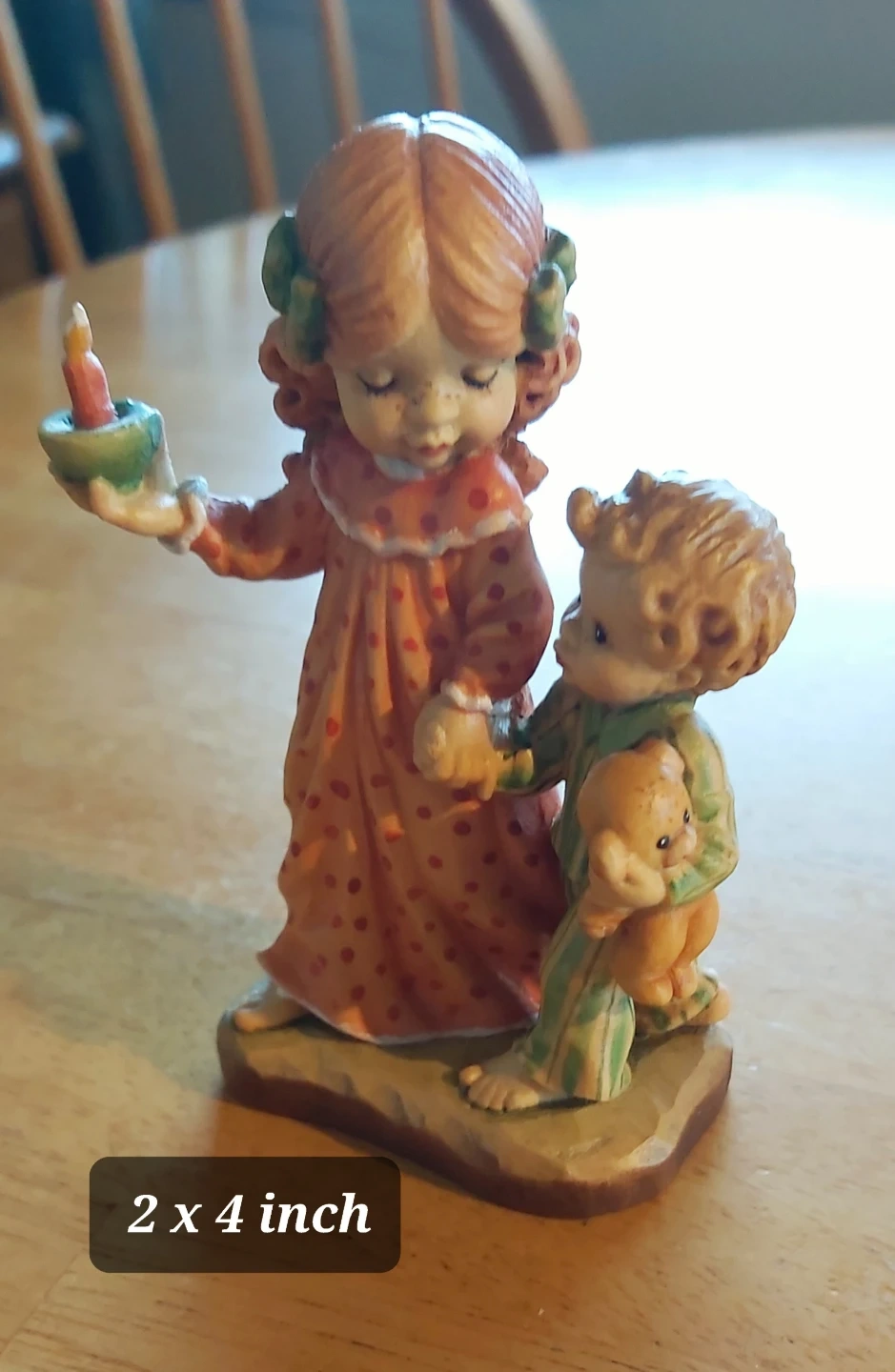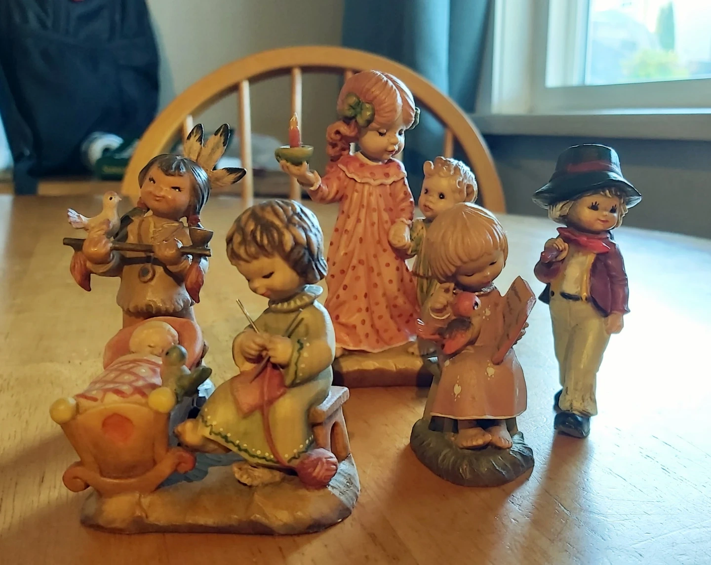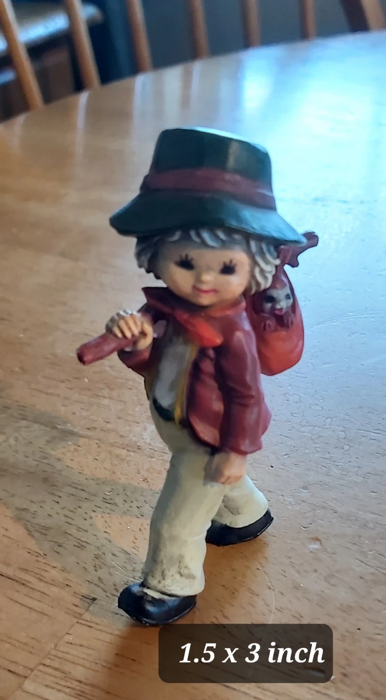 Collection of charming figurines designed by Valentine. Pieces include an indigenous child with a bird, a pair of children with a candle and teddy bear, and a boy with a hat and satchel. This set is made in Italy.