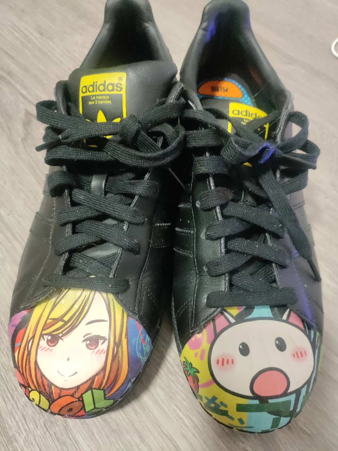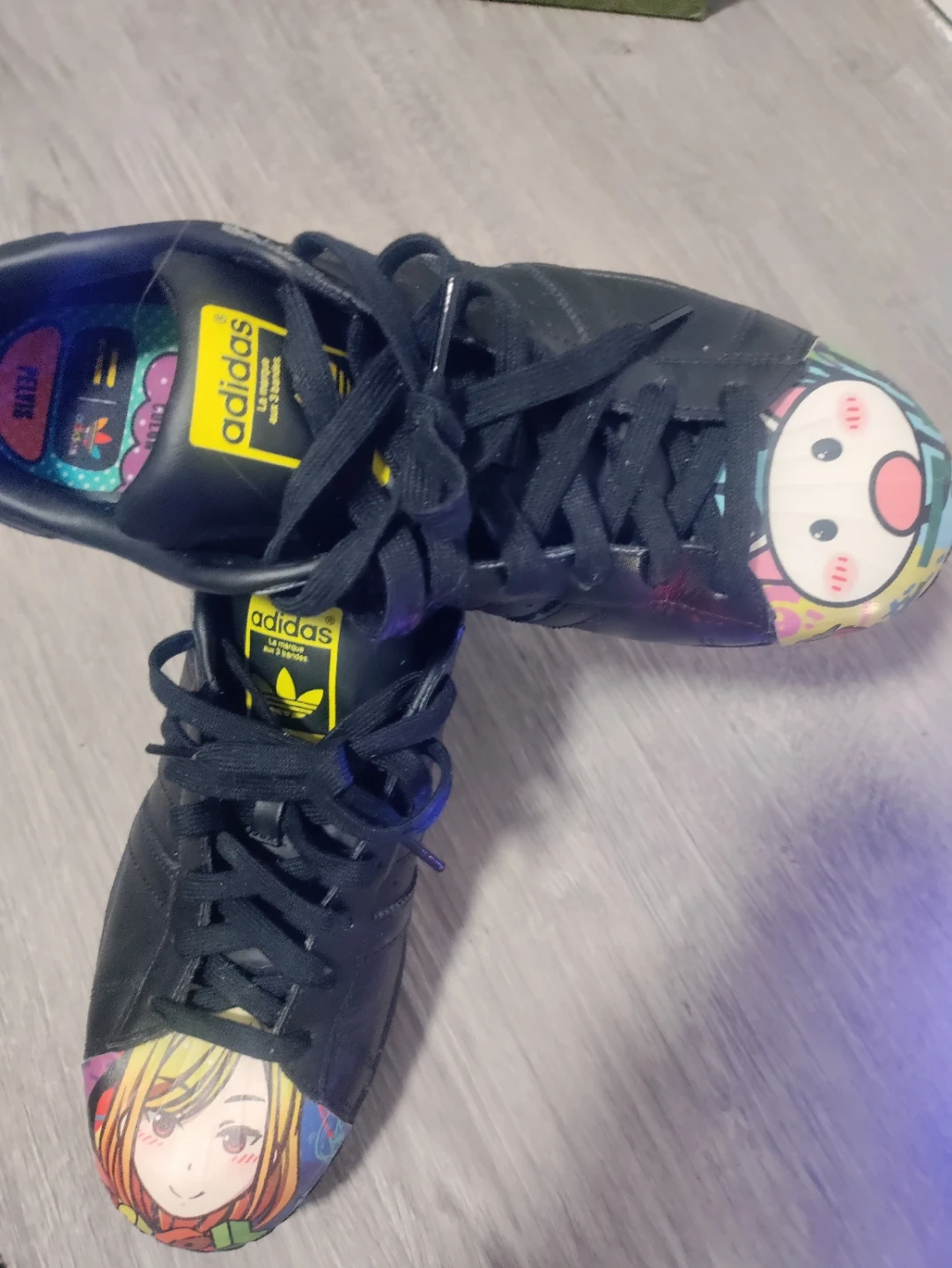 Black Adidas Superstar sneakers with anime-style cartoon graphics on the shell toes. These shoes feature the iconic three stripes and shell toe design. Leather upper.