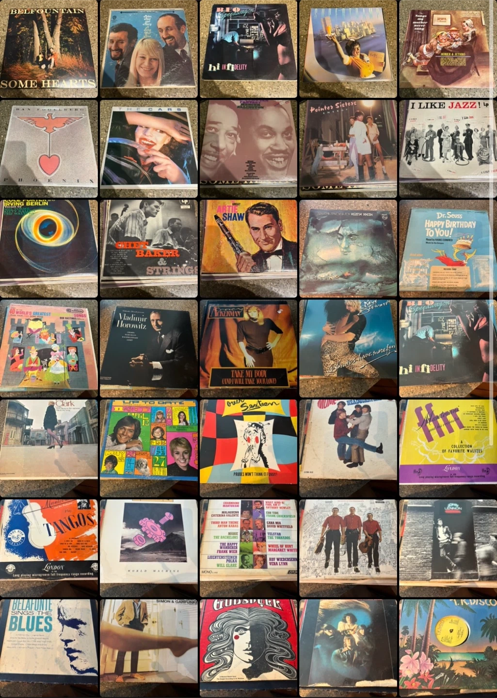 Big mixed vinyl lot with classic rock, pop, disco, jazz, classical, soundtracks, kids’ records, and a few vintage 45s. Includes poster inserts and a record brush.
