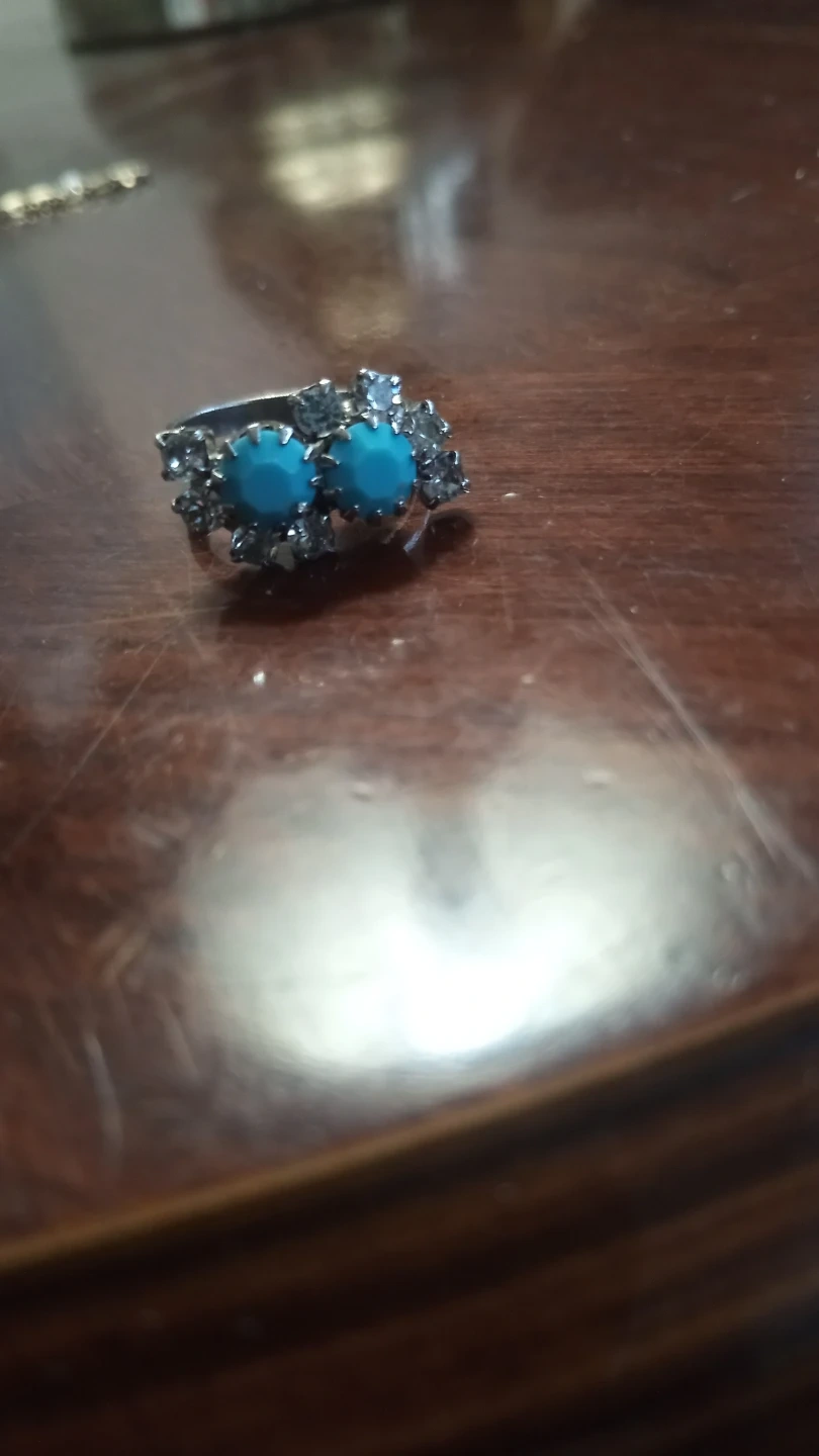 Selling a vintage ring featuring turquoise stones surrounded by rhinestones. It's in good condition and ready to add a touch of retro charm to your collection