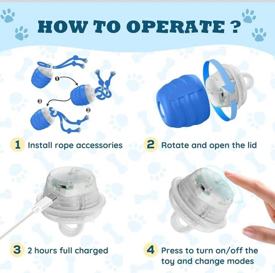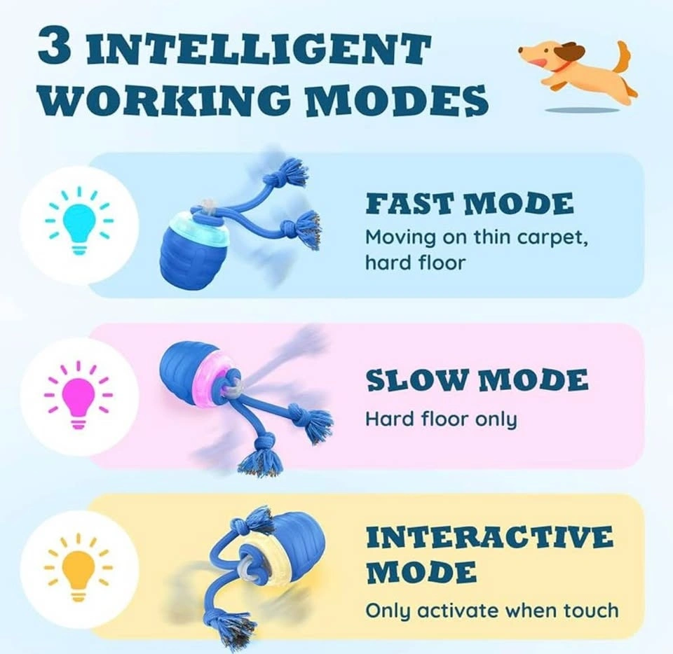 This interactive dog toy provides fun playtime for your pet. It rolls in erratic patterns and has built-in audio functions like chirping bird sounds and Bluetooth for music. It's motion-sensing and activates with a touch. For best results, fully charge the ball before first use. To turn off the bird sound, press the button twice (red light flashes twice). To turn it back on, press twice again (green light flashes twice). It has three modes: fast rolling (blue light), slow wandering (purple light), and interactive mode (green light). You can switch modes by short-pressing the power button. It works well on carpets, hardwood, and tile, indoors and out. To access the power button, unscrew the outer shell. Press once to turn on (fast mode). For Bluetooth, enable it on your phone and select 'Dog toy 01' to pair. You can then play any sound from your phone. To mute the toy, quickly press the power button twice. The toy is USB rechargeable via Type-C cable (adapter not included) and takes about 2 hours for a full charge. It's great for birthdays and holidays, helping to keep dogs busy and alleviate boredom or anxiety. Package includes: 1 Smart Dog Ball, 2 Long Ropes, 1 Type-C USB Cable, 1 User Manual.
