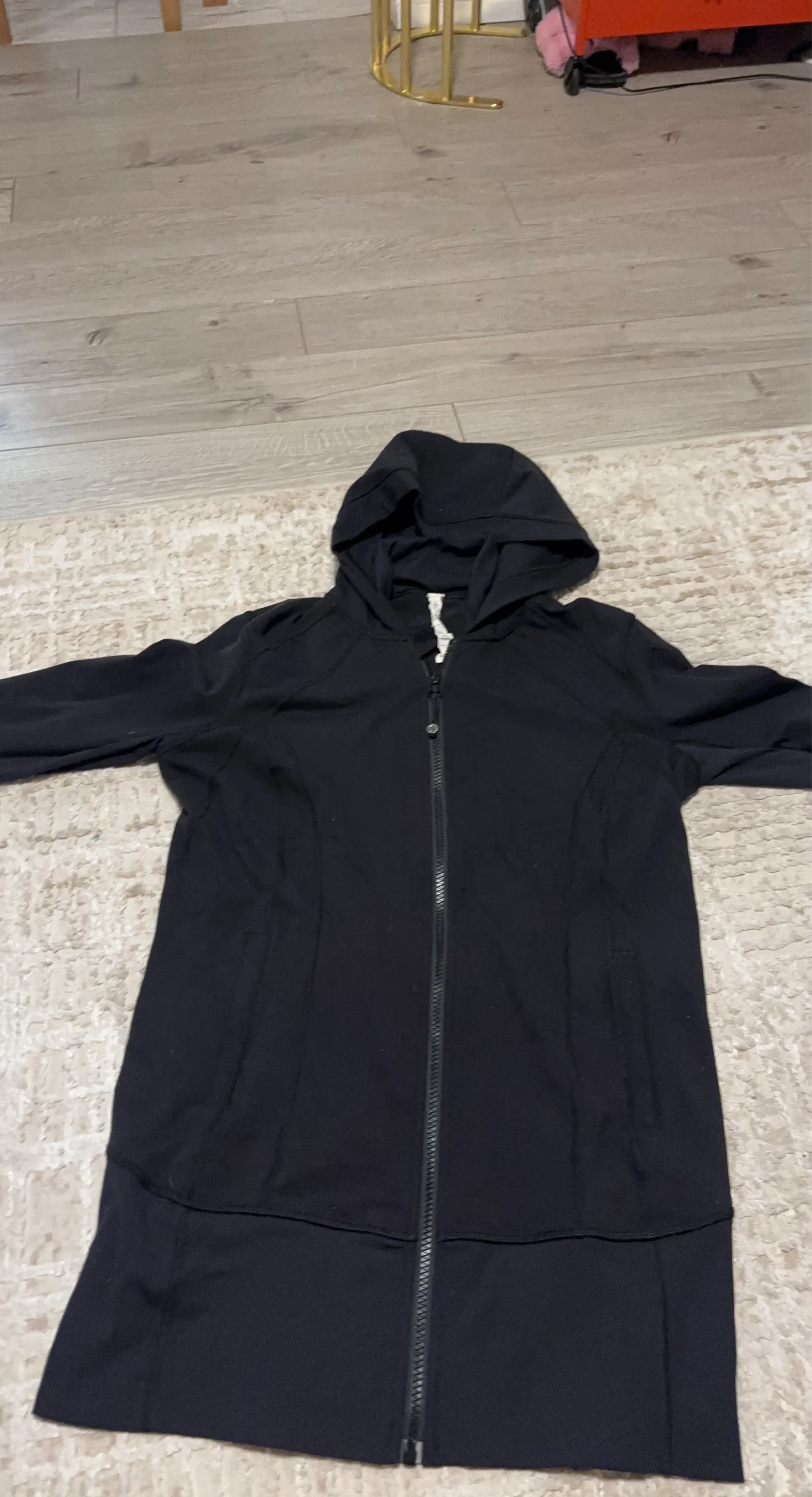This is a Lululemon black zip-up hoodie jacket. It's made from a comfortable, soft fabric perfect for everyday wear. Features a full zip closure and two front pockets.
