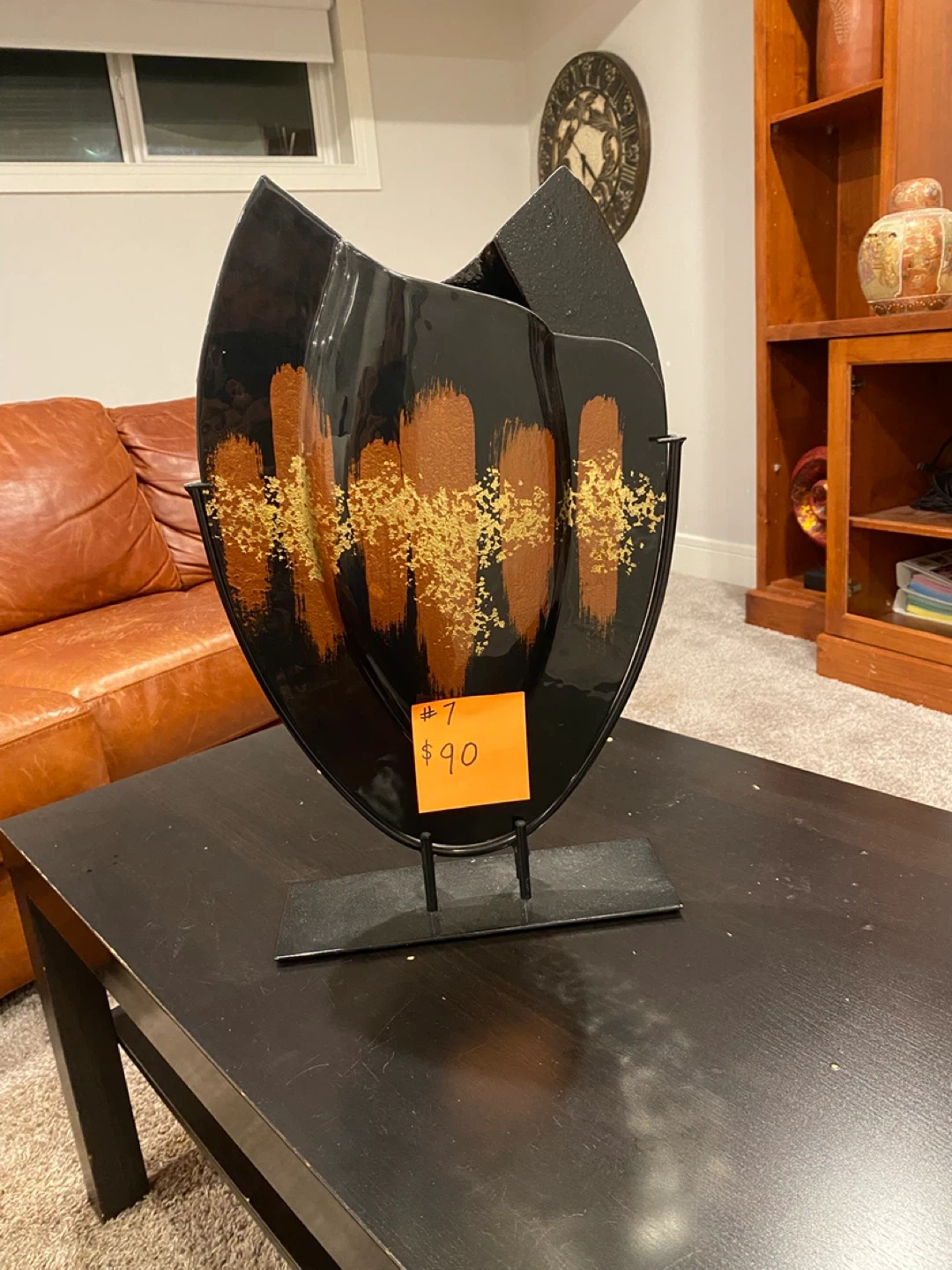 Unique black decorative vase with striking gold accents! It's in great condition and would look lovely in any room. The vase has a modern and artistic design, perfect for adding a touch of elegance to your home decor. Originally bought from Bowring