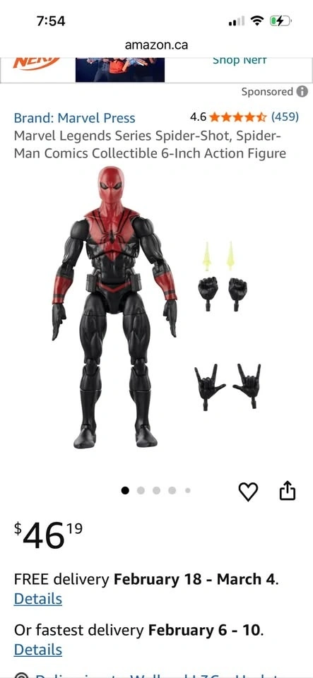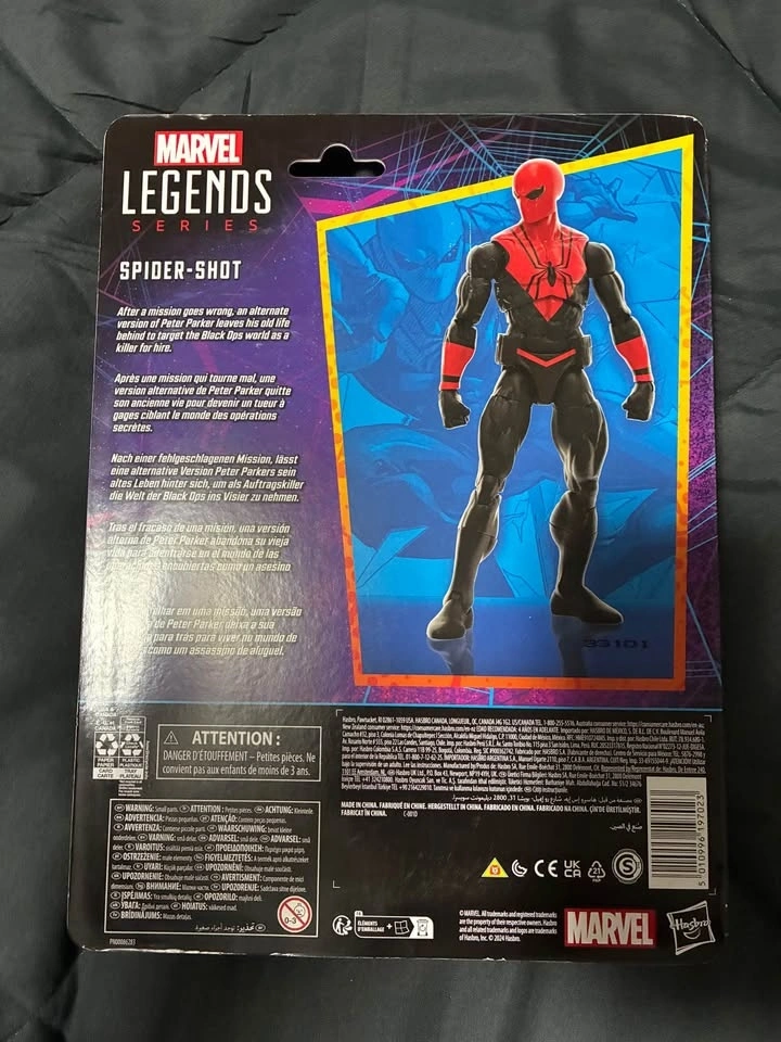 This is a Marvel Legends 6-inch Spider-Man Retro Collection Spider-Shot action figure from Hasbro. It features multiple points of articulation and comes with accessories like alternate hands and blast effects. The character is an alternate version of Peter Parker. The packaging has a vintage, retro style, and the costume is black with red accents and a unique spider emblem. This figure sells for $45+ on Amazon.