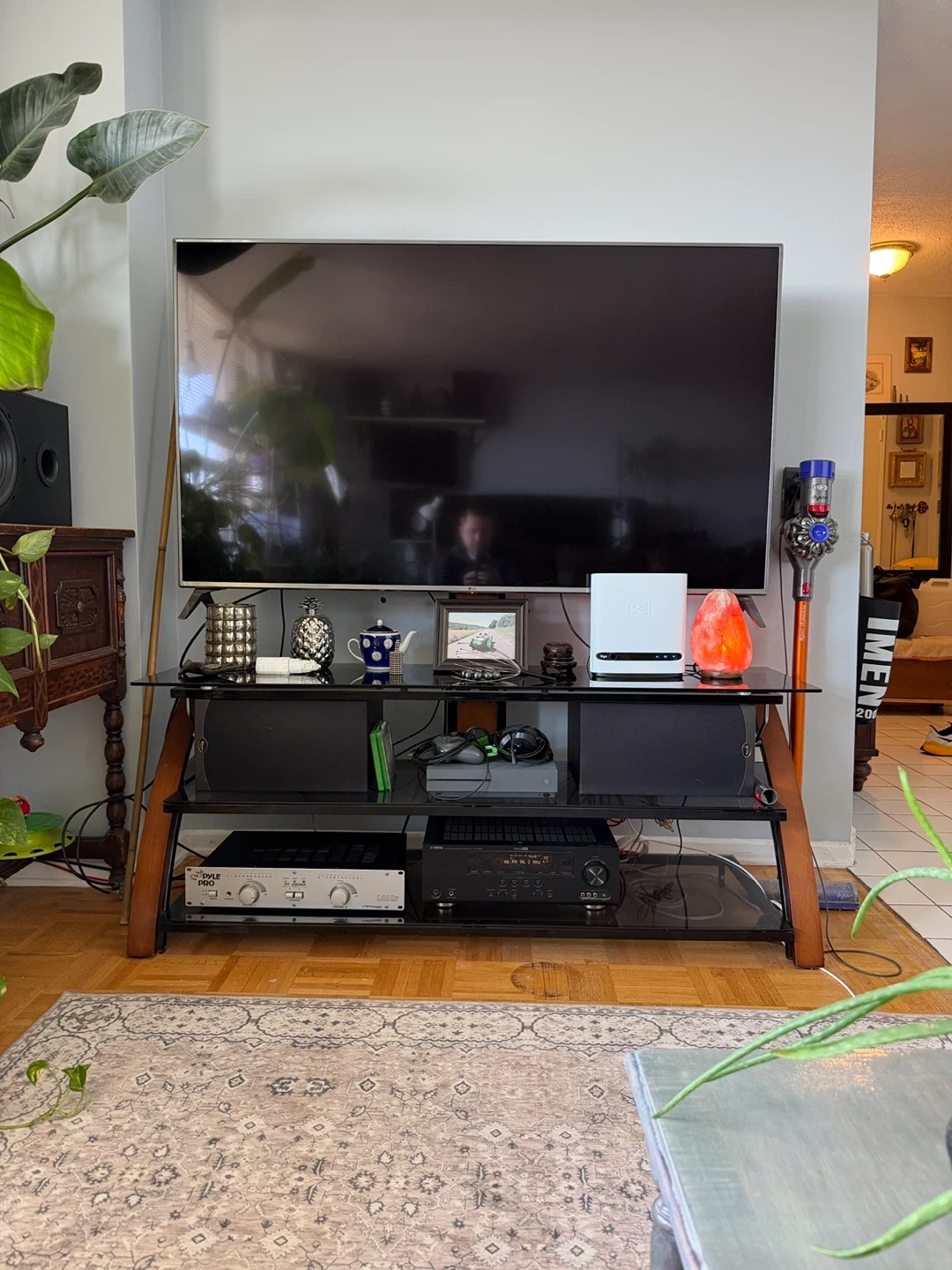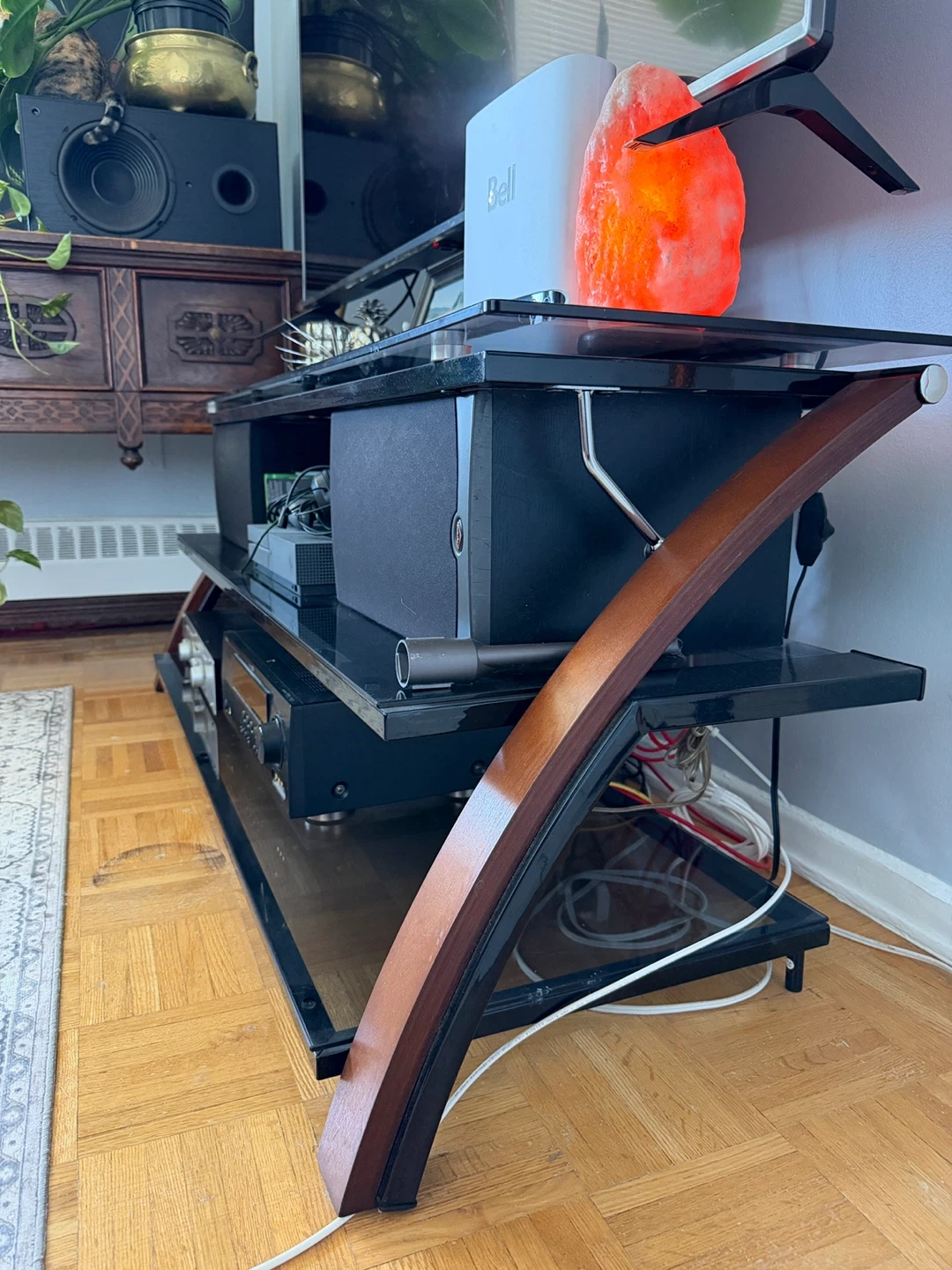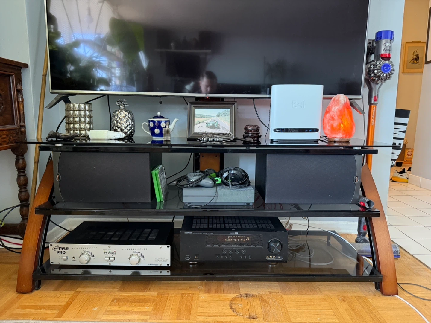 This media console features a sleek glass top and sturdy wooden legs. It offers ample space across three tiers for your TV and audio equipment. Perfect for organizing your entertainment setup!