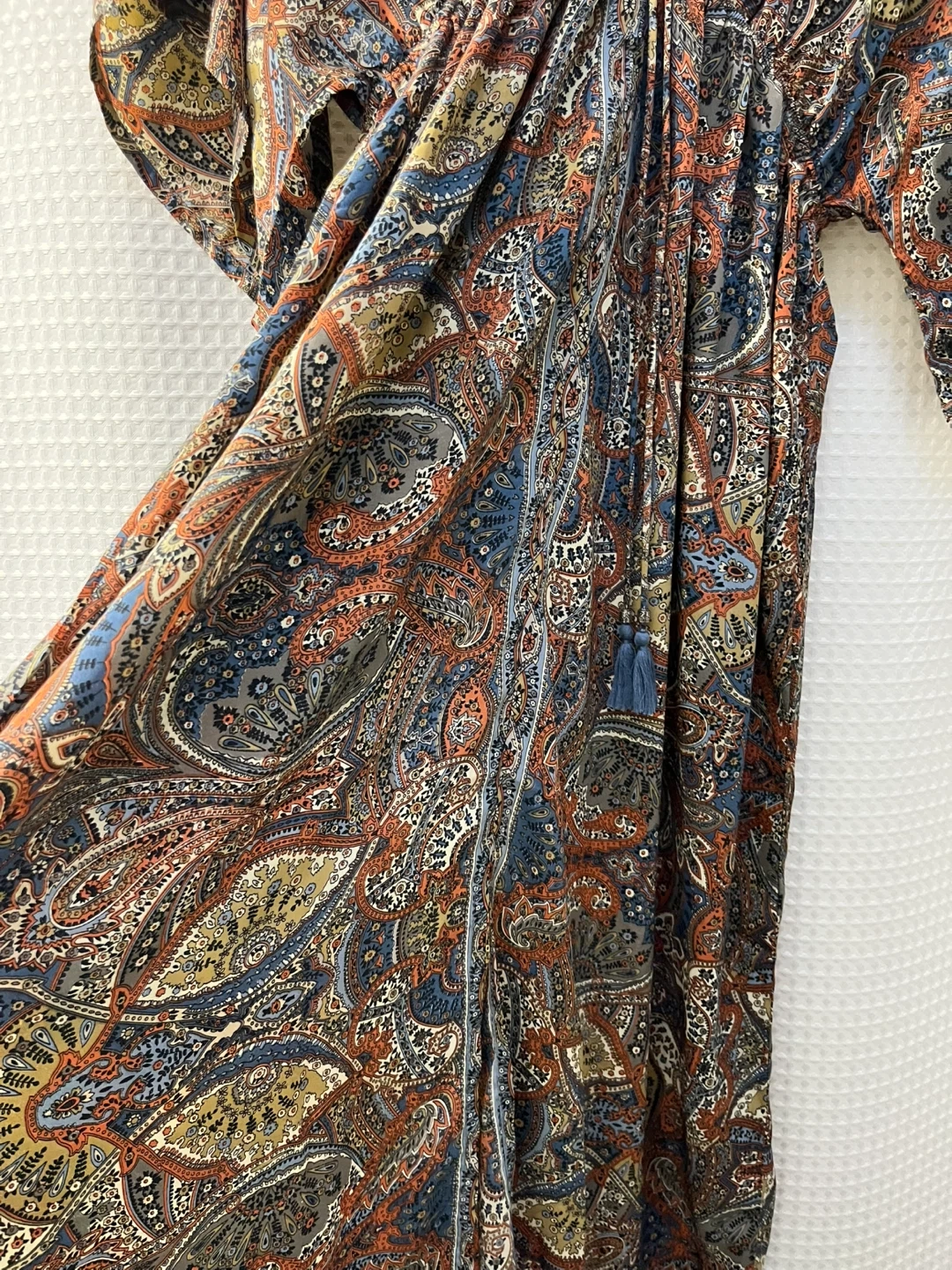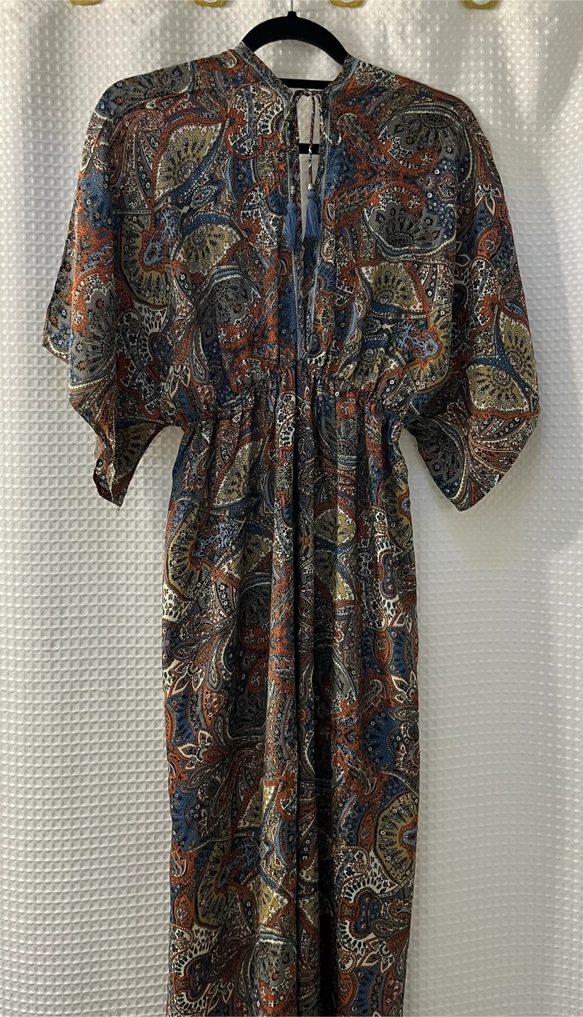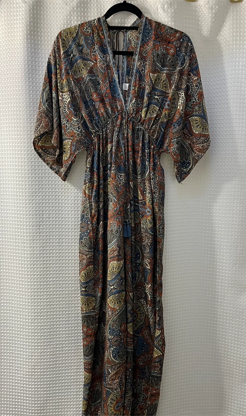 This flowy maxi dress features a vibrant paisley print with a V-neckline and cinched waist. It has wide, kimono-style sleeves and a drawstring detail with blue tassels at the neck. It's lightweight and perfect for warm weather! Material: Polyester blend.