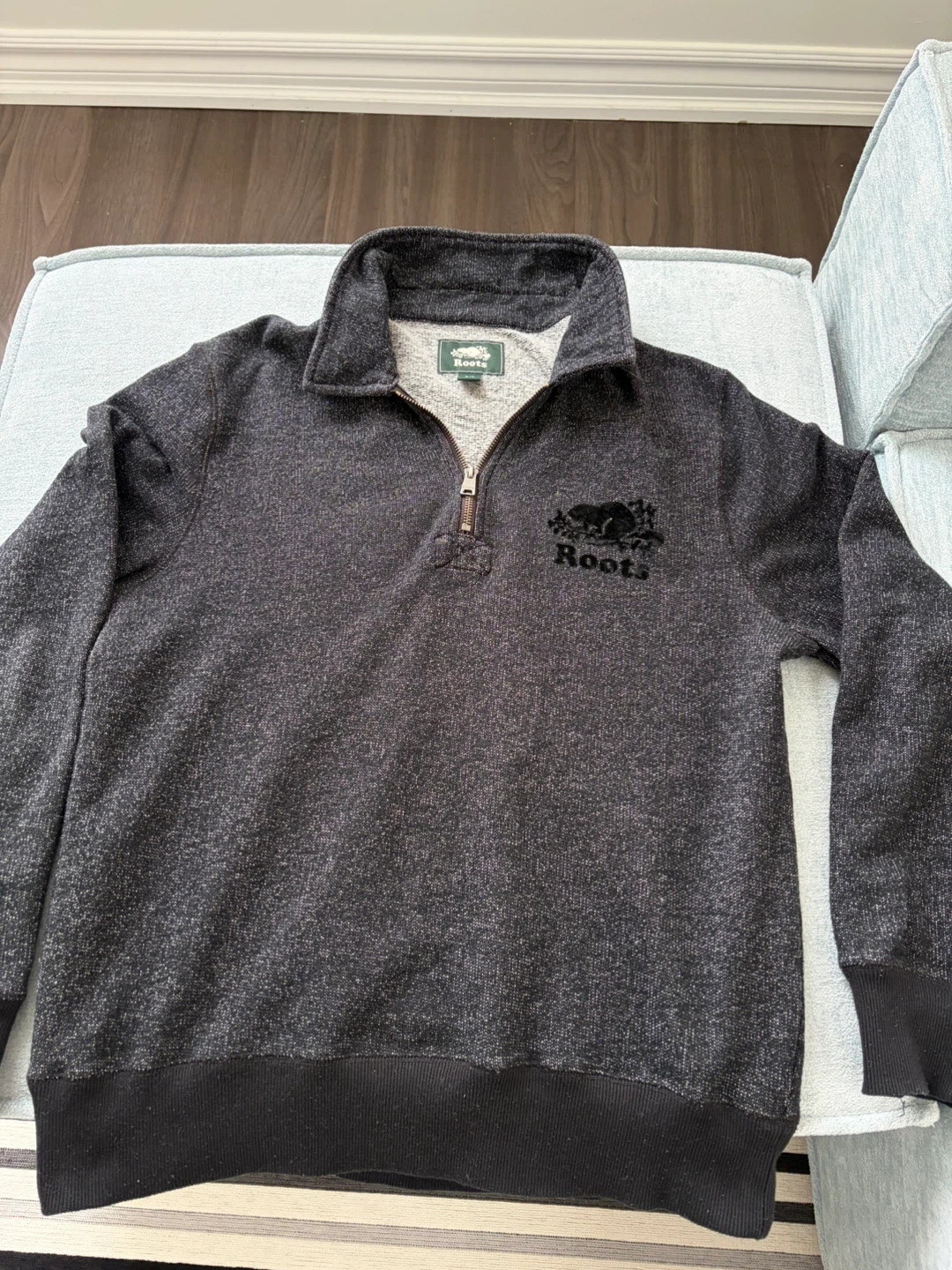 Like new Roots Original Half Zip Stein sweatshirt in charcoal grey marl. Features the iconic Roots beaver logo embroidered on the chest. Made with a blend of cotton and polyester for comfort and durability. Size is S but fits like M