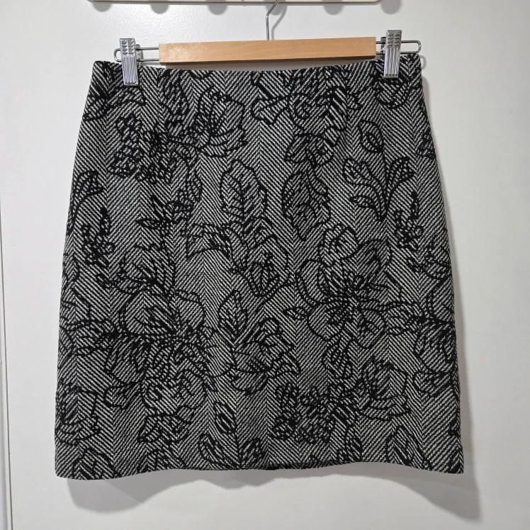 Grey chevron skirt with large floral overlay. Thick wool blend material. Mini skirt. Zips up the back.