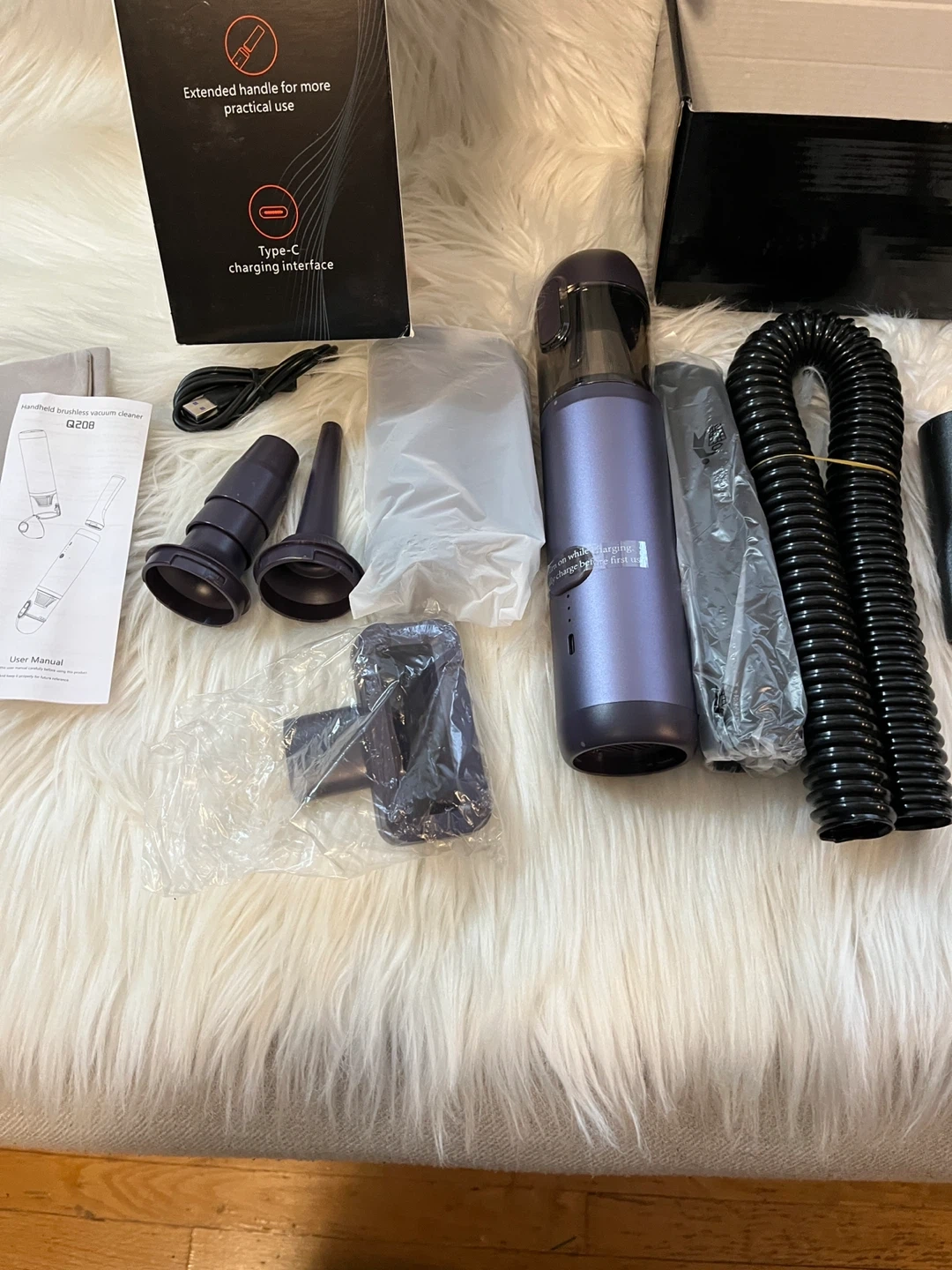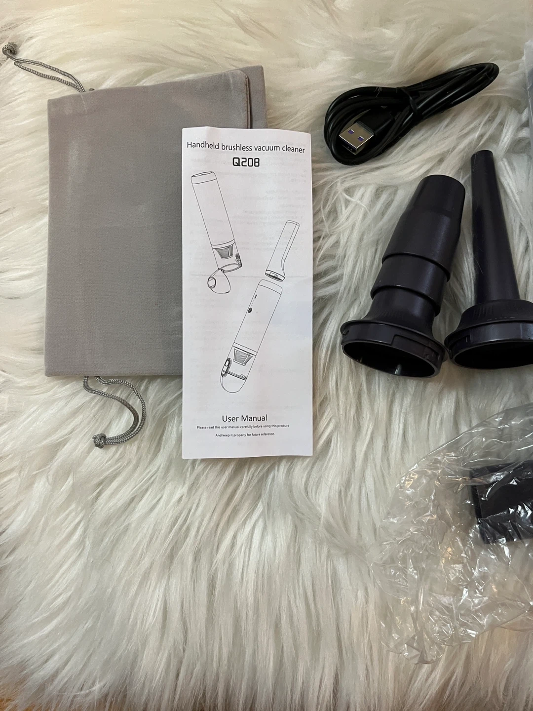 Selling a brand new, in-box handheld brushless vacuum cleaner, model Q208! It comes with all the accessories, including the user manual, various nozzle attachments, and a Type-C charging interface. The vacuum features a super suction of 16000pa and has a vacuum suction/inflation multi-functional use. The extended handle makes it practical to use!